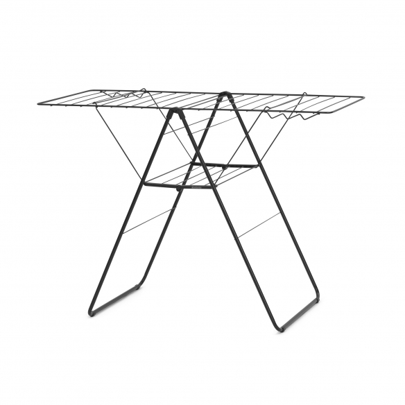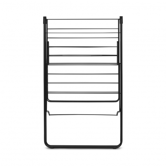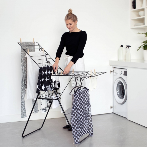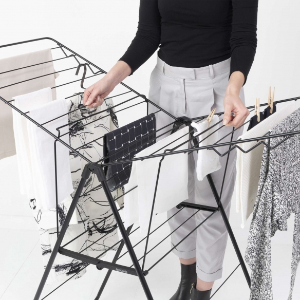 Clothesline from the HangOn collection, 20 meters long, made of resistant metal. Available in 3 color finishes, HangOn is an essential accessory in your home: it is light, practical, compact and uses space in an intelligent way! It can hold up to 3 loads of laundry and the height of the wings is adjustable! The dimensions remain contained, both when folded and when closed. The sturdy protective feet prevent damage to the floor and ensure great stability. The drying rack par excellence! Designed and made by Brabantia.