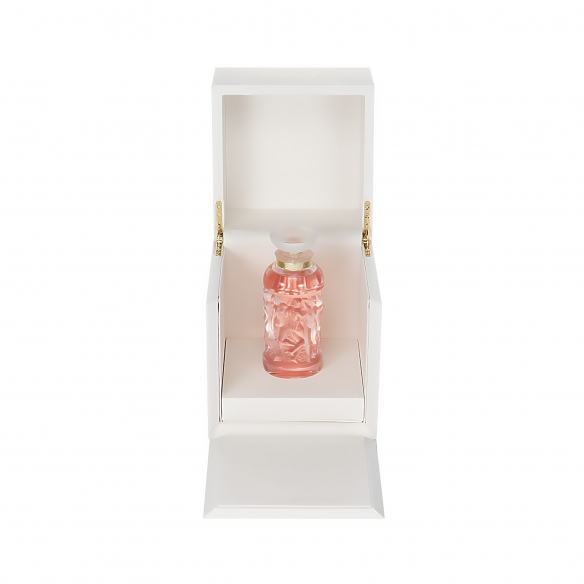 Perfume bottle 100 ml belonging to the Bacchantes collection, made of crystal. An object of great luxury and refinement, the Bacchantes perfume combines the beauty of crystal with the delicacy of a floral fragrance. An object of great artistic and olfactory value, which showcases a feminine and radiant personality. Designed by René Lalique.