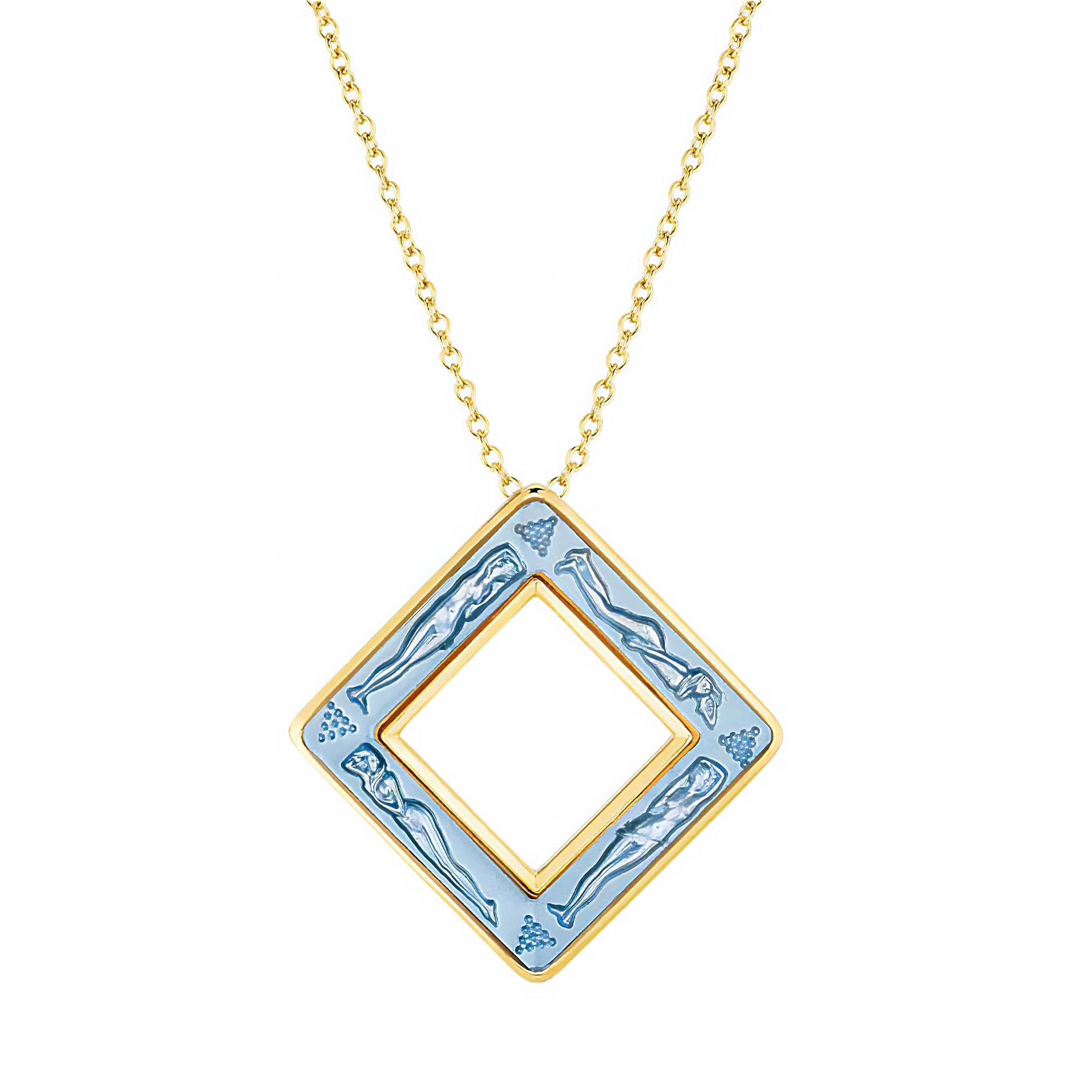 Bacchantes rhombus pendant in the "Blue" variant, made of crystal with a metal chain. Elegant and refined, the Bacchantes pendant represents four sculptural bas-relief nudes, which express an overwhelming sensuality and exuberant femininity. A jewel to wear to express romance and passion. Designed by René Lalique.
