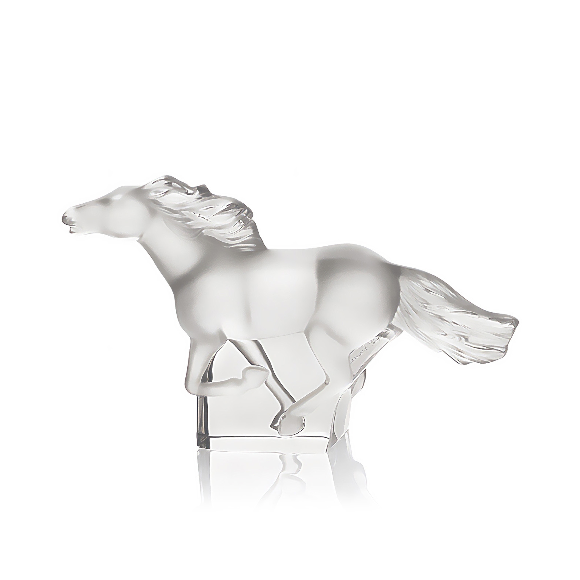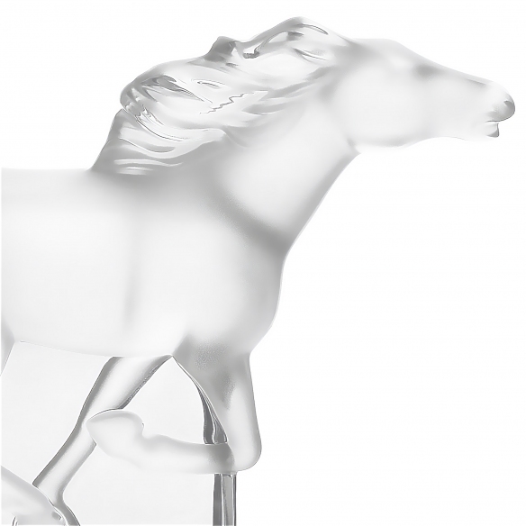 Kazak Horse sculpture made of crystal. Romantic and elegant, the Kazak Horse sculpture pays homage to man's most beautiful conquest, the horse, a symbol of strength and speed. The sculpture faithfully reproduces the proportions and details of the horse's body, with a dynamic and majestic pose. Designed by Marie-Claude Lalique.