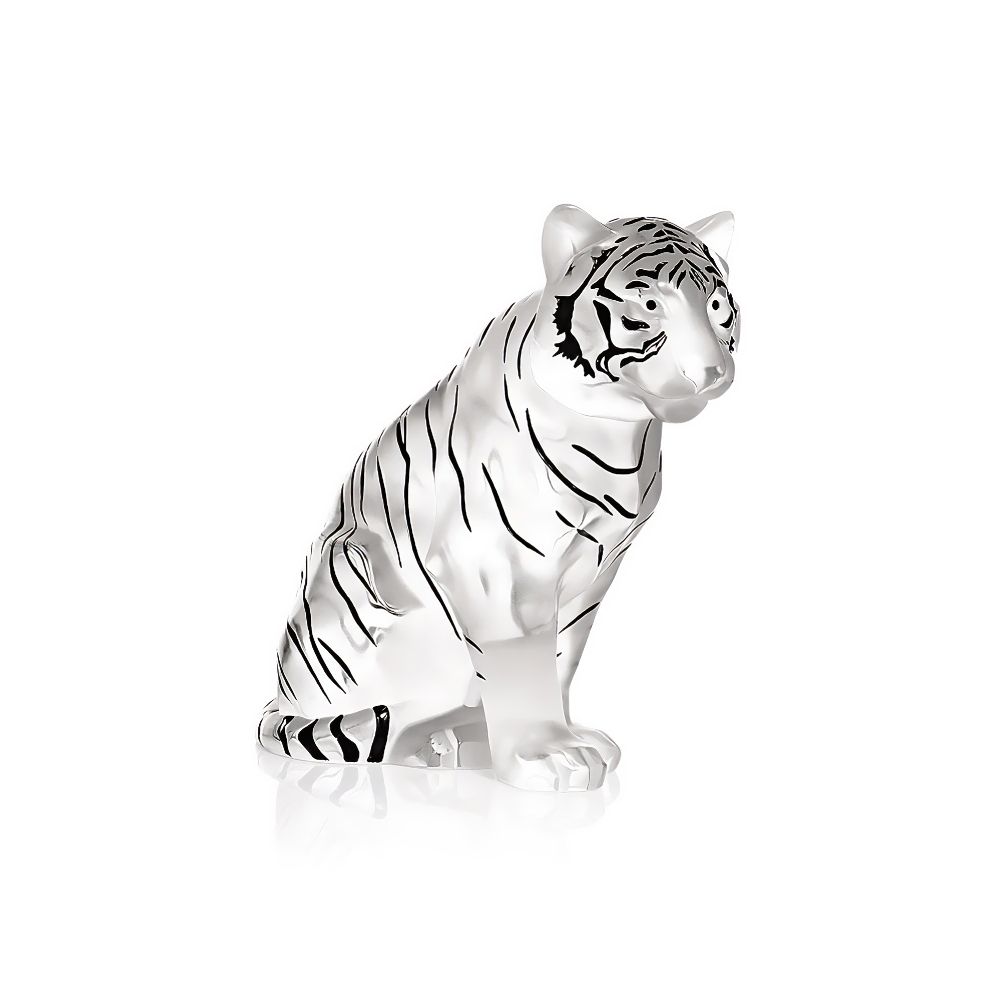 Sitting Tiger sculpture in the "Clear Black Enamelled" finish made of crystal. Portrayed as courageous, impulsive and solitary, this majestic crystal tiger represents the ferocious spirit of big cats. It is an impressive piece that evokes both Lalique's common theme of fauna and his tradition of symbolic power and aesthetic appeal. An absolute symbol of strength and determination that will add visual strength and emotion to your decor. Made by Lalique.