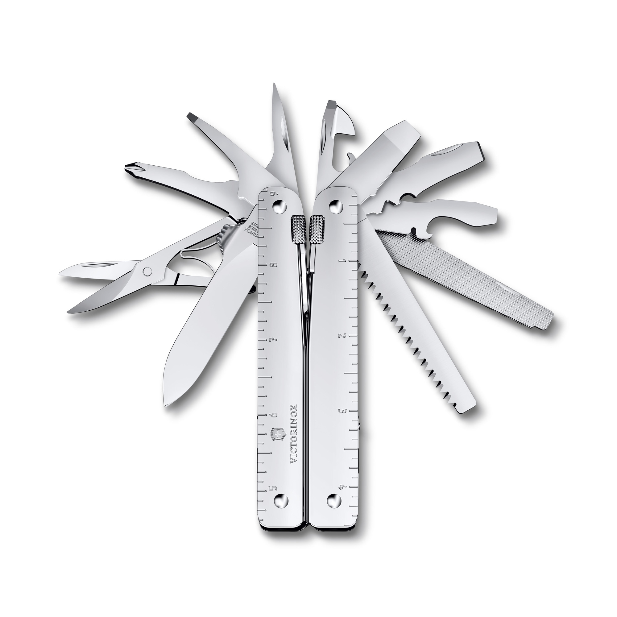 The Swiss Tool MX Silver multifunction tool is a high-quality steel instrument crafted by Victorinox. This accessory boasts an impressive 26 different functions, making it a perfect blend of style, innovation, and practicality. Do you collect these accessories or need to fix something at home? The Swiss Tool MX is perfect for you! Its ergonomic handle and individual locking mechanism for each tool ensure comfort and safety during use. Each tool is easily removable and replaceable, allowing for precise and reliable work. The Swiss Tool MX multifunction tool is a beautifully designed accessory made to tackle any challenge, an ideal companion for craftsmen or lovers of these particular instruments. Moreover, its size makes it perfect to fit inside a pocket or inside a backpack. Purchase this highly useful accessory right here, on Newpop.it, and discover the world of Victorinox!