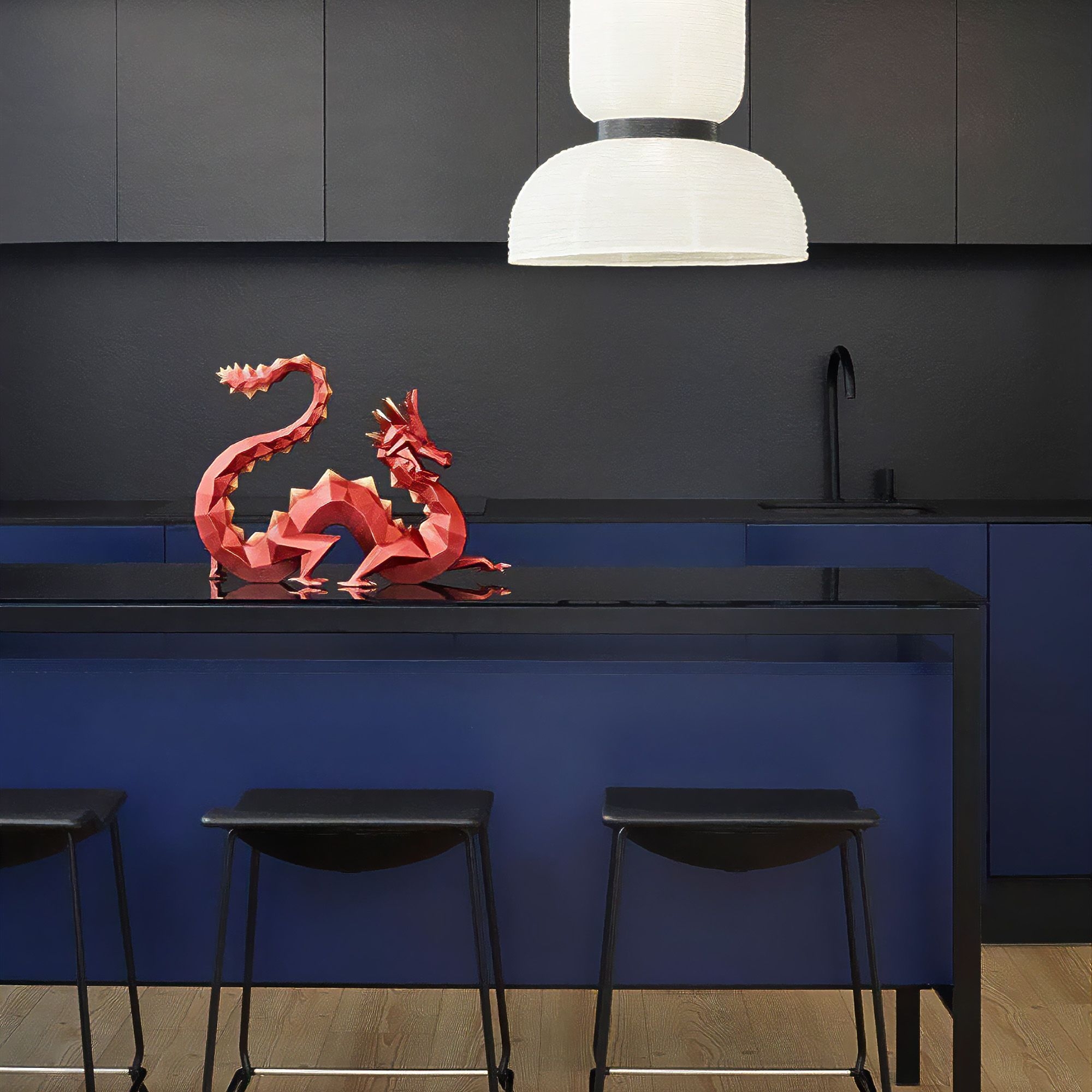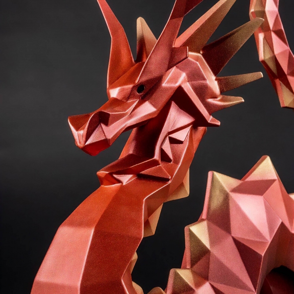 The Dragon Sculpture, Limited Edition consisting of only 777 pieces, is a fantastic representation of one of the most iconic and majestic mythical creatures from Eastern culture, created entirely in matte porcelain by Lladró, a material valued for its durability and elegance. This magnificent sculpture is a universal symbol of power, luck, and good fortune, and it's not just a decorative item, but rather a snapshot that seems to capture a moment of grace and composure of the creature. The Dragon is part of the Origami collection, and for its decoration, natural mineral pigments were selected, later covered by a layer of metallic oxide to enhance the intense red color that dominates the composition; this shade is further enriched by a play of contrasts with gold details, which embellish the finish of the piece with a touch of elegance. The Dragon Sculpture is an interesting addition to your home or office, or serves as an ideal gift for parties, housewarmings, or other special occasions. Designed by José Luis Santes for Lladró.