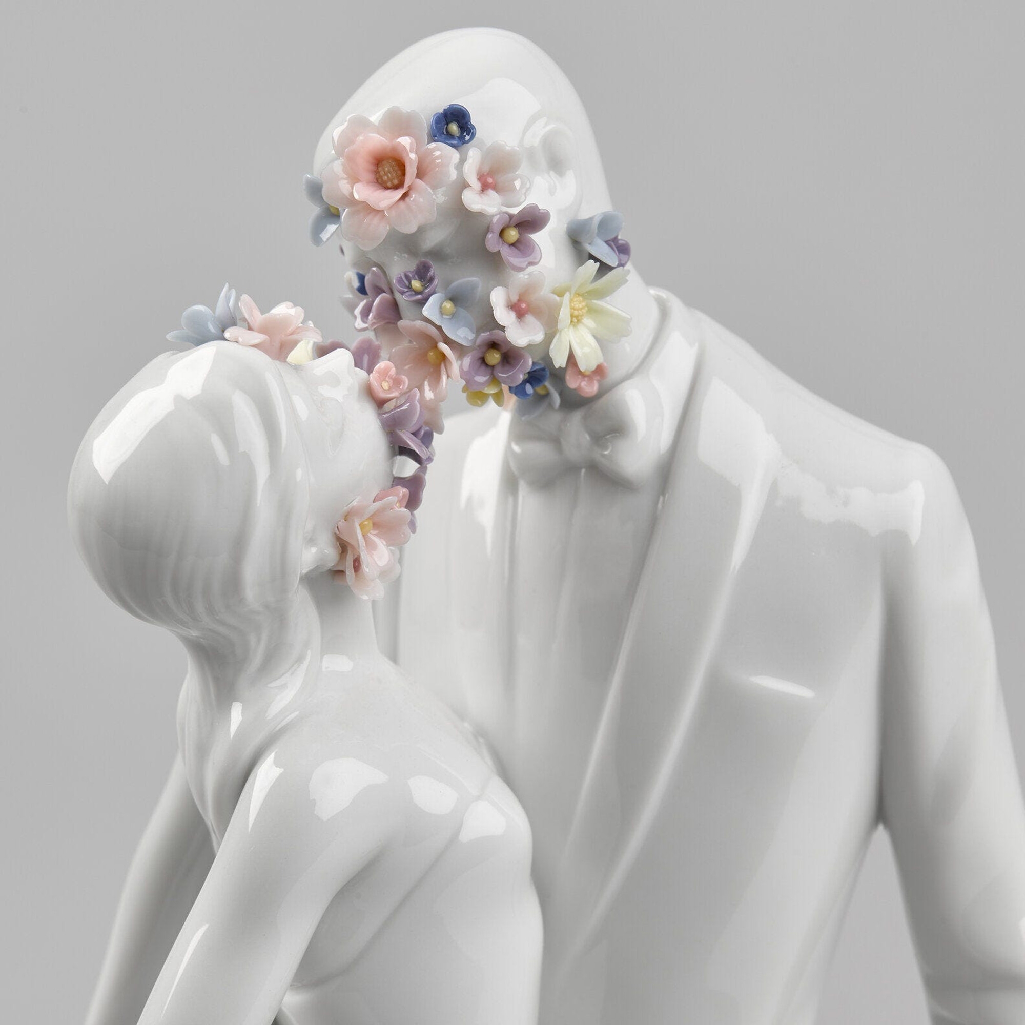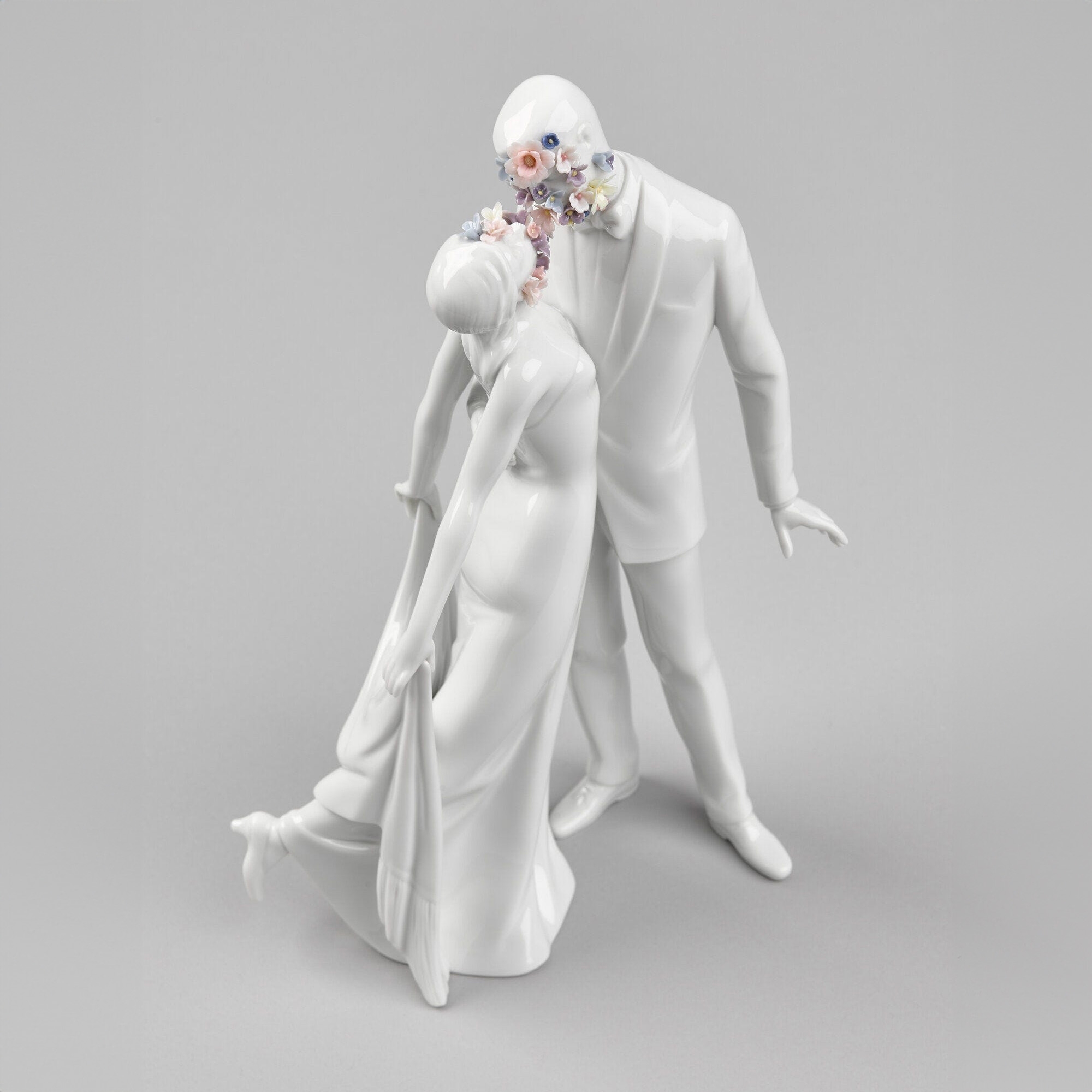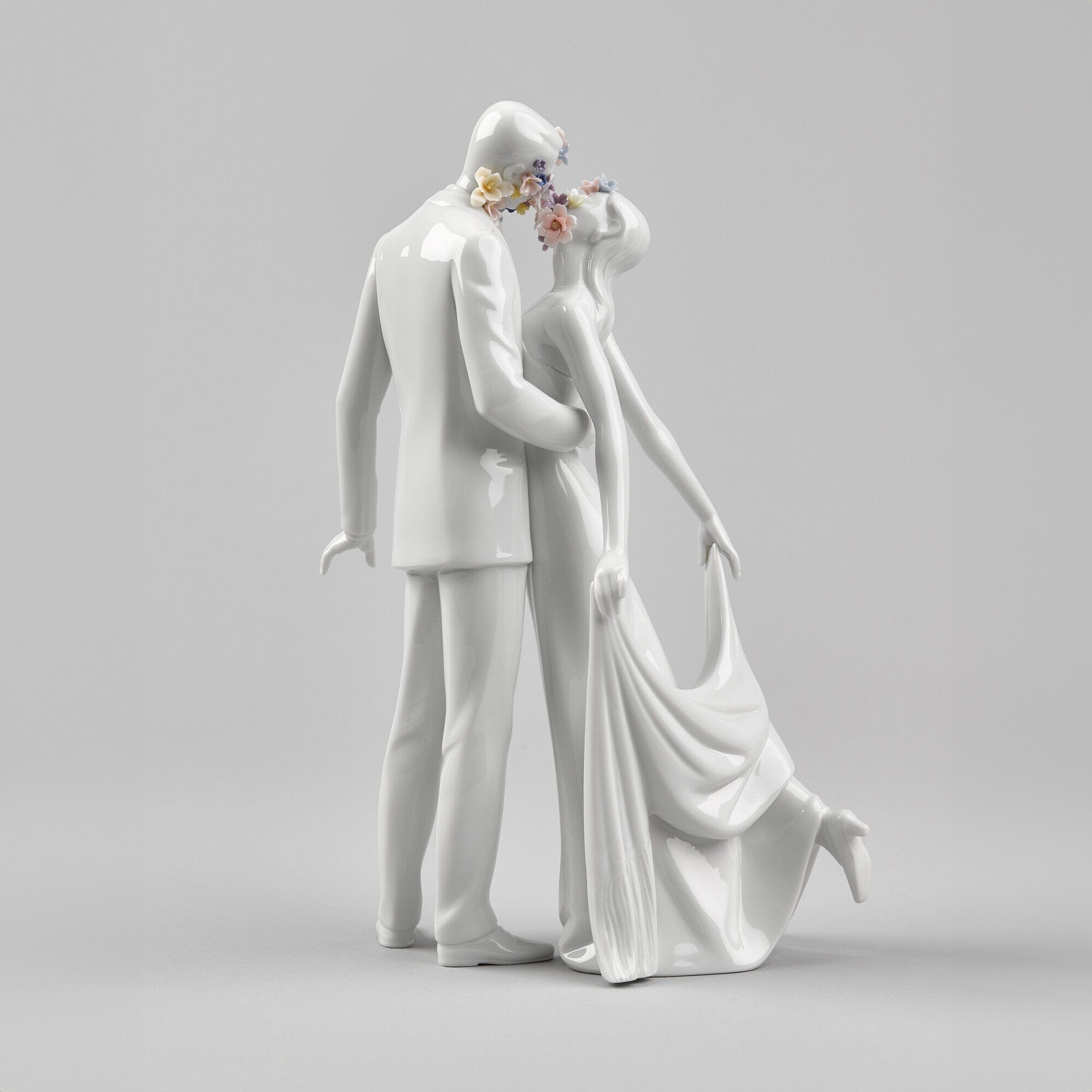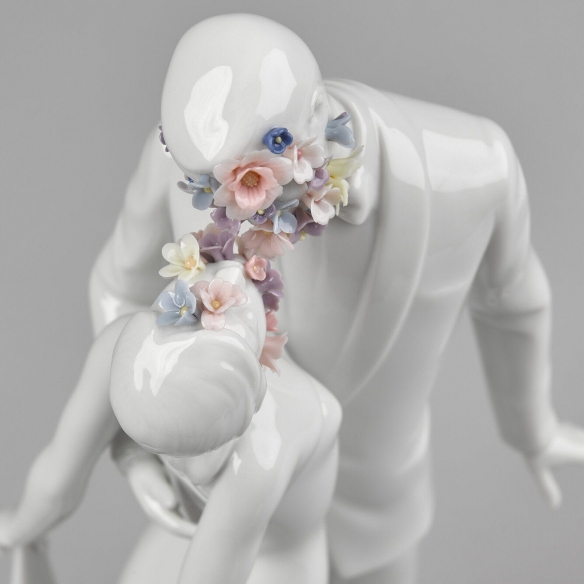 The Love I Couple figurine is an artwork that encapsulates the tenderness, affection, and bond between a couple of newlyweds, crafted by Lladró entirely in glossy white porcelain, a material renowned for its elegance and durability. This exquisite figurine depicts a pair of spouses kissing and conveys the concept of eternal love and immense complicity; the white of the porcelain symbolizes the innocence and purity of love, while the colored flowers represent the vibrancy and happiness of the couple when together. The Love I Couple figurine is an exceptional addition to any home or business office, promising to uniquely and incomparably enhance any setting. The details are crafted with extreme precision: every curve, every gaze of the subjects conveys a sense of tranquility and fulfillment. The Love I Couple figurine is an ideal gift for art enthusiasts or for special occasions such as housewarmings and weddings. This piece is not just an artwork but also a testament to shared emotion and the timeless narrative of love. Designed by the Committee and sculpted by Virginia González for Lladró.