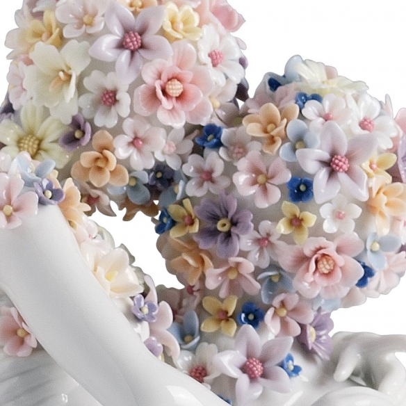 The Love II Couple figurine is an artwork that embodies the tenderness, affection, and connection between two newlyweds, made entirely from glossy white porcelain by Lladró, a material praised for ensuring elegance and durability. This magnificent figurine depicts a couple embracing and kissing, carrying with it the concept of eternal love and boundless complicity; the porcelain's white symbolizes the innocence and purity of love, while the colored flowers represent the vibrancy and happiness of the couple when together. The Love II Couple figurine is an outstanding addition to any home or commercial office, promising to enrich all spaces in a unique and unparalleled manner. The details are meticulously cared for: every curve, every detail of the subjects communicates a sense of calm and fulfillment. The Love II Couple figurine is an ideal gift for all art enthusiasts, or for special occasions such as inaugurations and weddings. This piece is not merely an artwork but also a testament to shared emotion and the timeless narrative of love. Designed by the Committee and sculpted by José Puche for Lladró.
