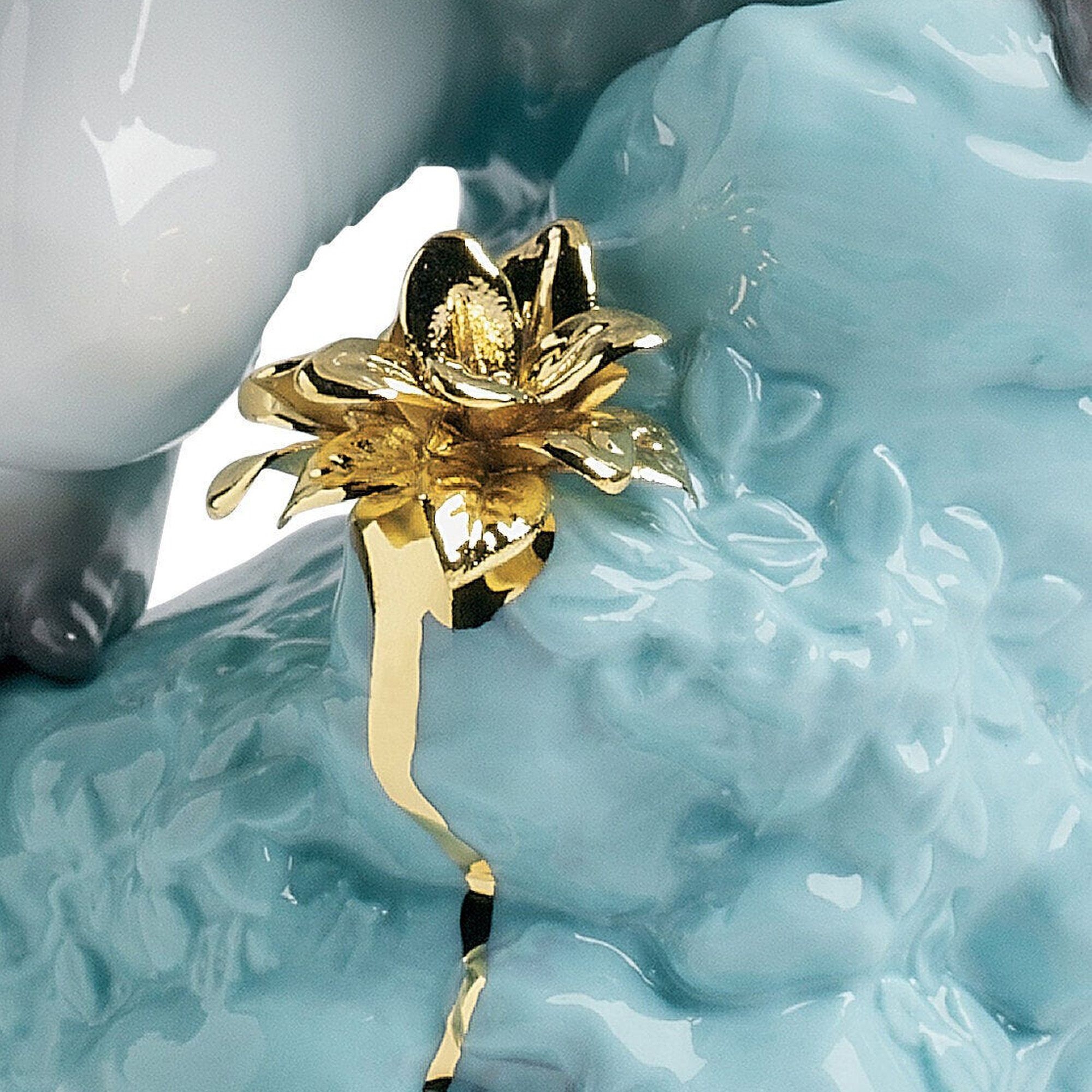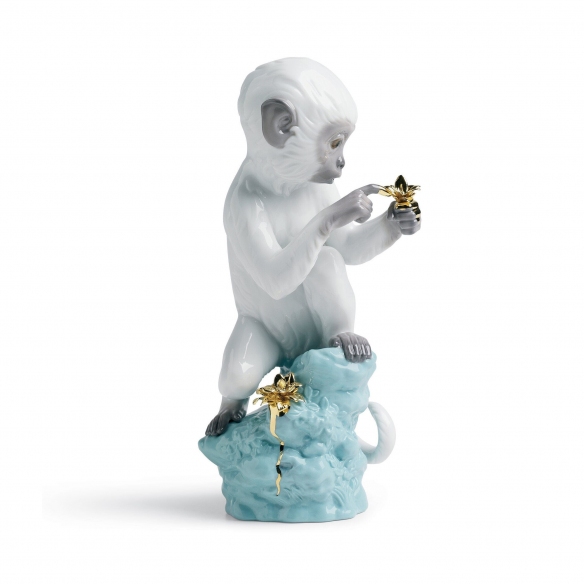The "Curiosity - Monkey on Turquoise Rock" figurine is an extremely refined and detailed expression of Lladró's artistic skill and innovation, crafted in glossy porcelain and metal, materials valued for their durability and longevity. This charming figurine captures a unique moment of a monkey sitting thoughtfully on an elegant turquoise-colored rock, holding gold-colored flowers in its hands. With a graceful and natural design, the Monkey on Turquoise Rock represents both a decorative choice of taste and sophistication, and a symbol of reflection and curiosity, providing a subject for meditation on life to those who observe it. The Curiosity figurine can be an excellent addition to any home or commercial office, bringing a touch of nature to the interior environments. Moreover, the work serves as the ideal gift for all enthusiasts of the animal kingdom or simply for all lovers of art. Every detail is perfected, from the monkey's face to its fur, from the rock's ripples to the colors, demonstrating excellence in the use of porcelain. Designed by Committee and sculpted by Alfredo Llorens for Lladró.