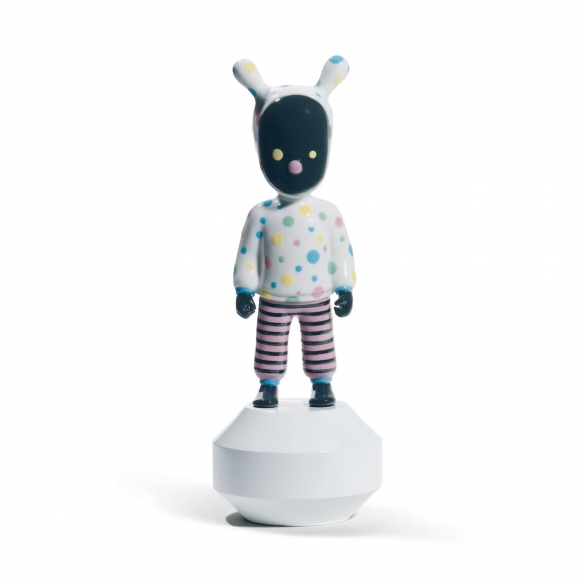 The Guest figurine by Devilrobots, in its small model, numbered edition, is a fantastic and charming work of art created by Lladró entirely in glossy porcelain, in various shades of pink, yellow, blue, black, and white, combined with a white wooden base, materials renowned for their elegance and longevity. The Guest boasts a unique and modern design, capable of adding a touch of charm to your home; this statuette can be matched with any setting and style of décor: whether it is placed inside a library with a classic design, within a minimalist living room, or on a bedside table in an avant-garde bedroom, The Guest figurine by Devilrobots will capture the gaze of all your friends and relatives. This figurine acts as an invitation to creative and imaginative dialogue, becoming an icon that brings contemporary art into homes. The small model is perfect for collectors and art lovers who desire a piece with strong character but also suitable for limited spaces. This decorative product embodies the desire to experiment within the limitless boundaries of porcelain art, always carrying with it the unmistakable savoir-faire of Lladró. Designed by Devilrobots and sculpted by Raul Rubio for Lladró.