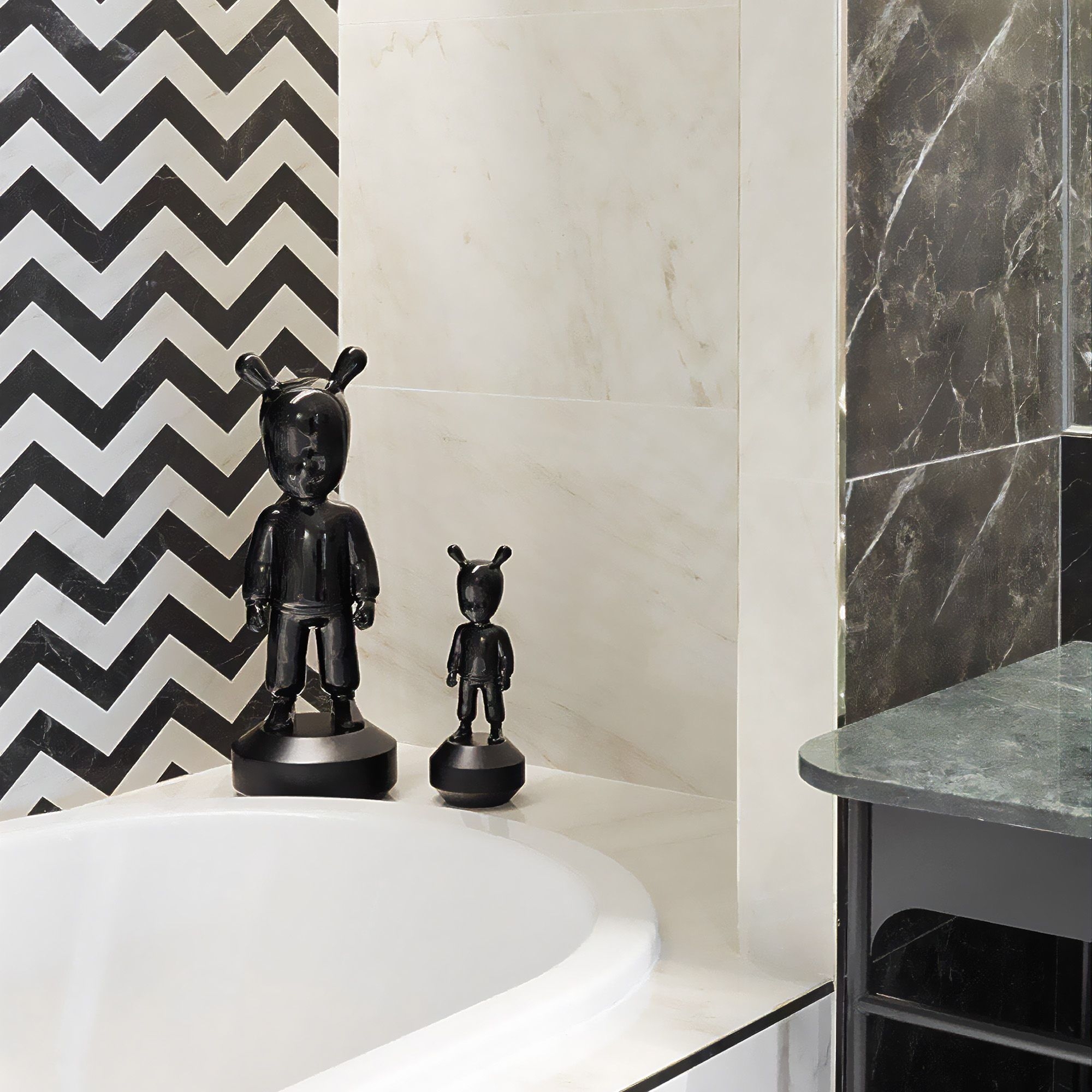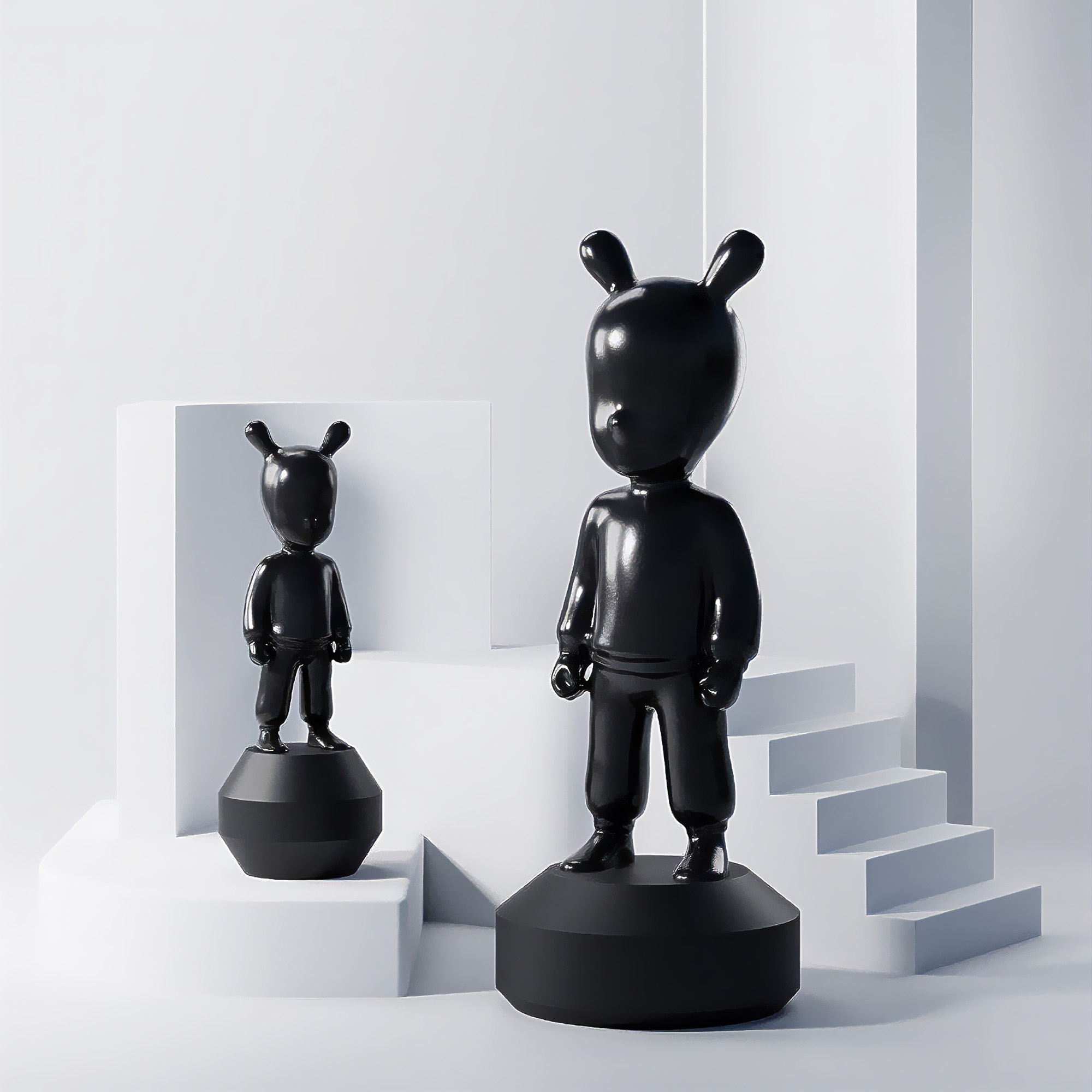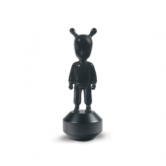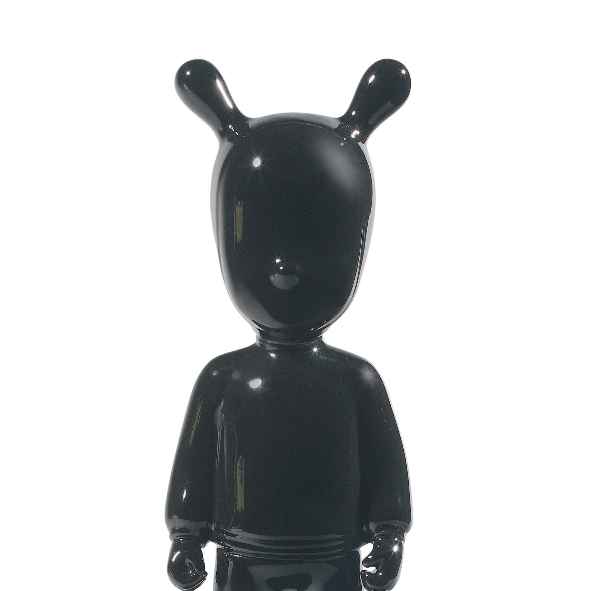The Black Guest figurine, in its small model, is a fantastic and charming work of art created by Lladró entirely in glossy black porcelain, and mounted on a black wooden base, materials admired for their elegance and longevity. The Black Guest showcases a unique and modern design capable of adding a touch of elegance to your home. This figurine can complement any environment and decorating style, whether it's placed inside a library with classic design, within a minimalist living room, or on a bedside table in a cutting-edge bedroom, The Black Guest will capture the gaze of all your friends and relatives. It represents an invitation to creative and sophisticated dialogue, becoming an icon that brings contemporary art into homes. The small model is perfect for collectors and art enthusiasts who desire a piece with a strong character but also suitable for limited spaces. This decorative product embodies the desire to explore the boundless realms of porcelain art, always carrying the unmistakable savoir-faire of Lladró. Designed by Jaime Hayon and sculpted by Raul Rubio for Lladró.