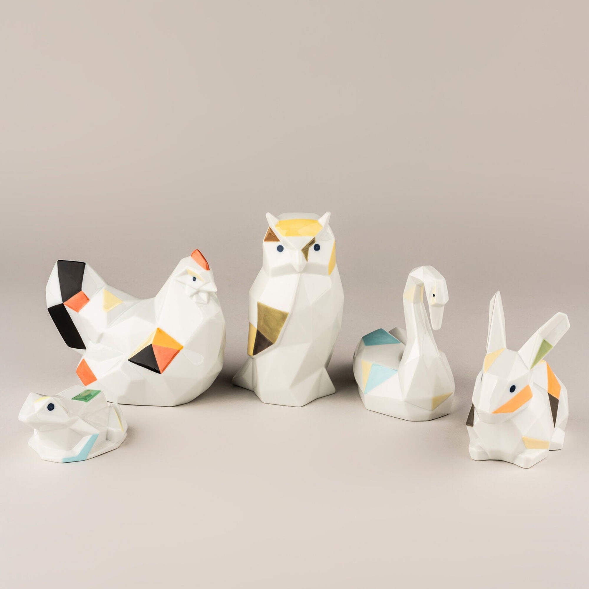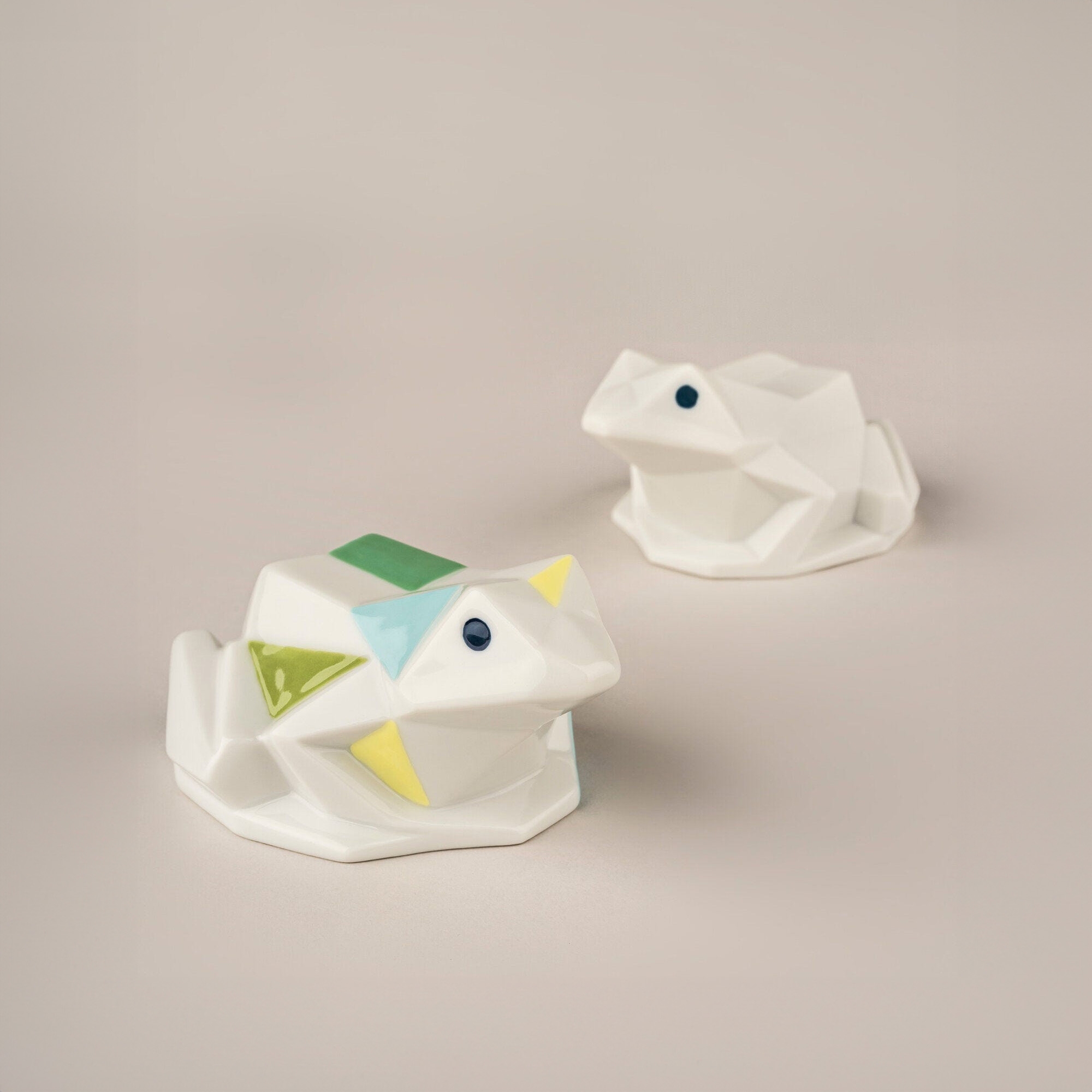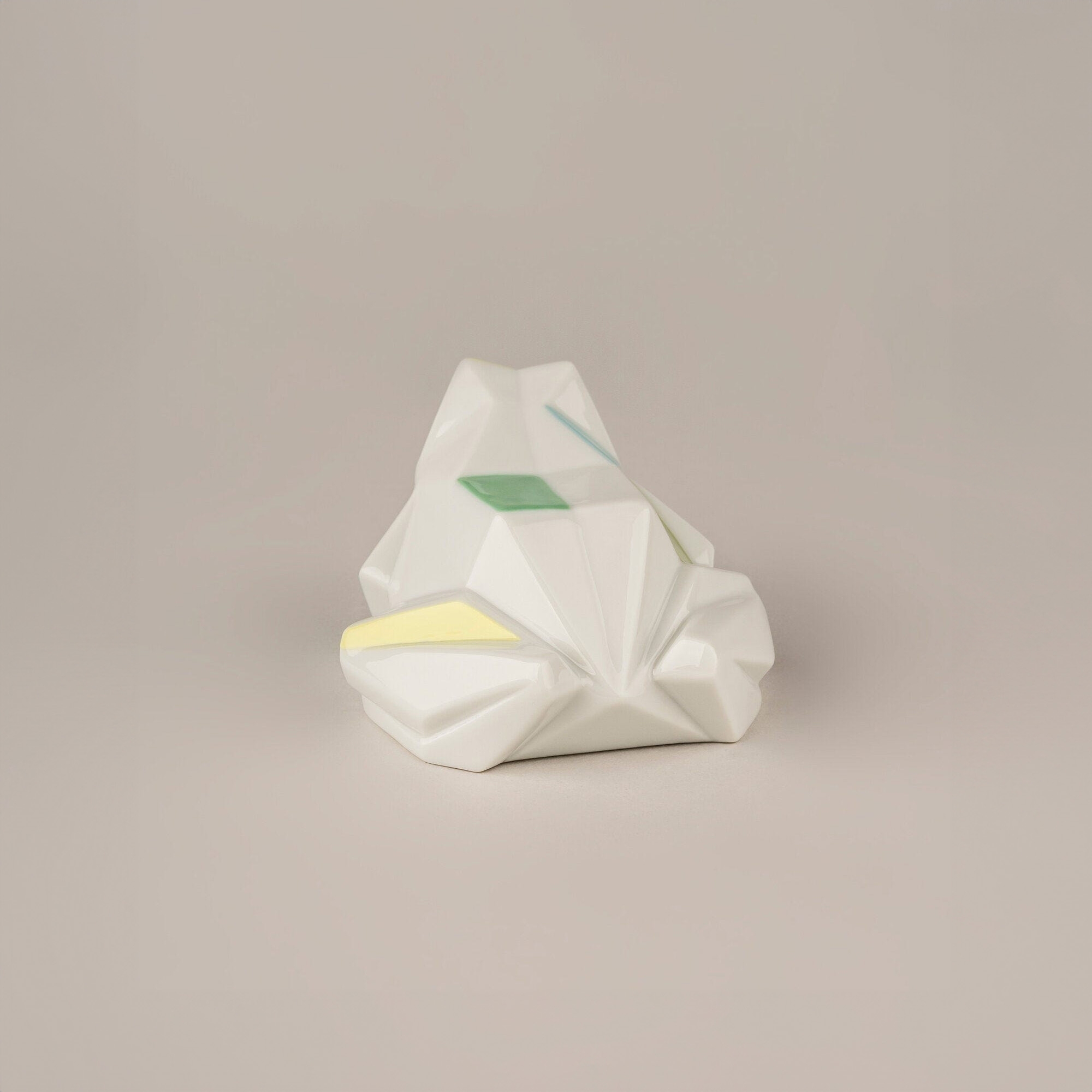 The Frog Figurine is an innovative piece from the Origami collection by Lladró, made entirely of polished porcelain, a material appreciated for its elegance and its considerable durability. It features a colored decoration of green and yellow, giving the figurine an unparalleled style. This Frog Figurine takes inspiration from the Japanese technique of paper folding, producing a delightful geometric figure; thanks to its innovative style, the Frog blends harmoniously with any setting and style of decor: whether placed inside a bedroom, in a modern living room, or in a more classical lounge, this piece will capture the attention of all your guests. Lladró's craftsmanship is showcased through the details and meticulous attention; every curve is designed to reflect the light in a different way, bringing the figure to life with a play of subtle shadows that accentuate the musculature and pride of this magnificent predator. The Frog Figurine is a perfect gift idea for housewarmings or other special occasions. Designed by Marco Antonio Noguerón for Lladró.