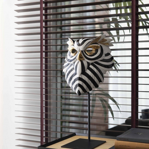 The Owl Mask is a stunning example of design that blends elegance, mystery, and sophistication, crafted by Lladró in glossy porcelain and metal with a gold-plated sterling silver finish. This magnificent Owl Mask draws inspiration from traditional African masks, and its bold, contemporary design makes it a match for any setting and decor style: whether placed in a modern living room or a minimalist home office, this mask becomes the focal point of conversations among guests. Moreover, the contrast between the black and gold colors adds a higher level of mystery and depth: the deep, dark black lends the mask an aura of secrecy and darkness; meanwhile, the gold details illuminate the figure of the owl, symbolizing wisdom and preciousness. This Owl Mask is not merely a decorative item for the home, but a true tribute to African tradition. Designed by José Luis Santes for Lladró.