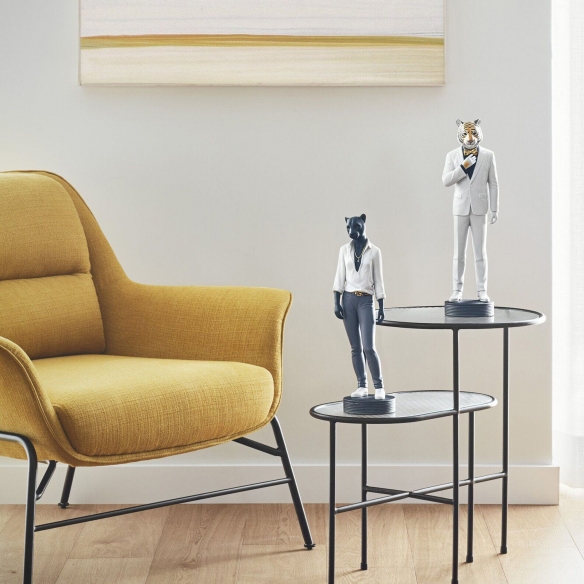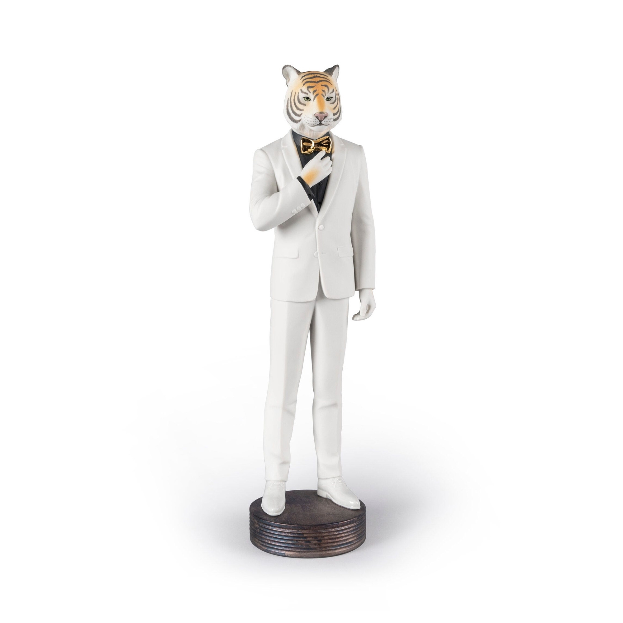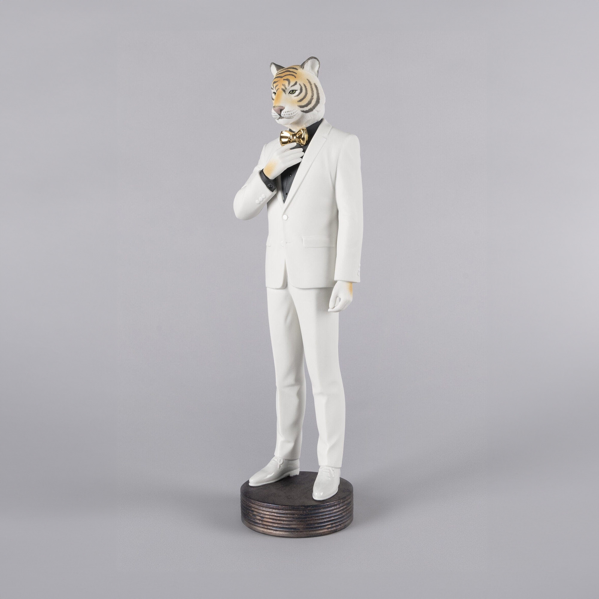 The Tiger Man figure is a spectacular sculpture made by Lladró, entirely crafted in matte porcelain, a material that ensures both durability and significant resilience. It's adorned with details in white, gray, and gold. This magnificent Tiger Man figure is inspired by ancient China, where the tiger is regarded as the King of all animals. Thanks to its unique and minimalist design, this sculpture perfectly complements any setting and decor style. Whether placed on a bedside table in the bedroom or in a classically styled living room, this Tiger Man figure will capture the attention of your guests and become the focal point of all conversations. With its dimensions, it occupies a place of honor in any collection. Indeed, the figure is not merely a decorative piece but a symbol of Lladró's dedication to craftsmanship, creativity, and the merger between art and nature. The Tiger Man figure is more than just a furnishing item; it's an emblem of the untamable part of the human spirit, a reminder of our affinity with the natural world, and a collectible piece that inspires admiration and reflection. Designed by Marco Antonio Noguerón for Lladró.