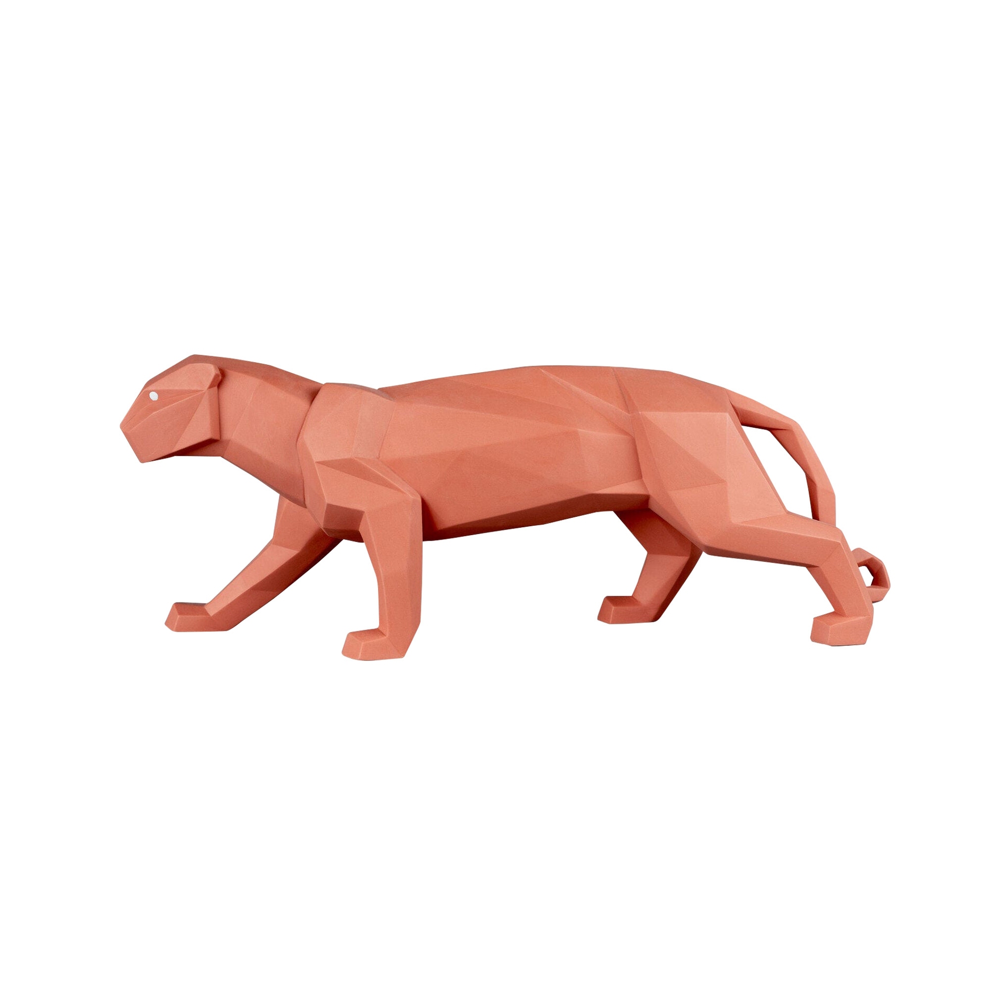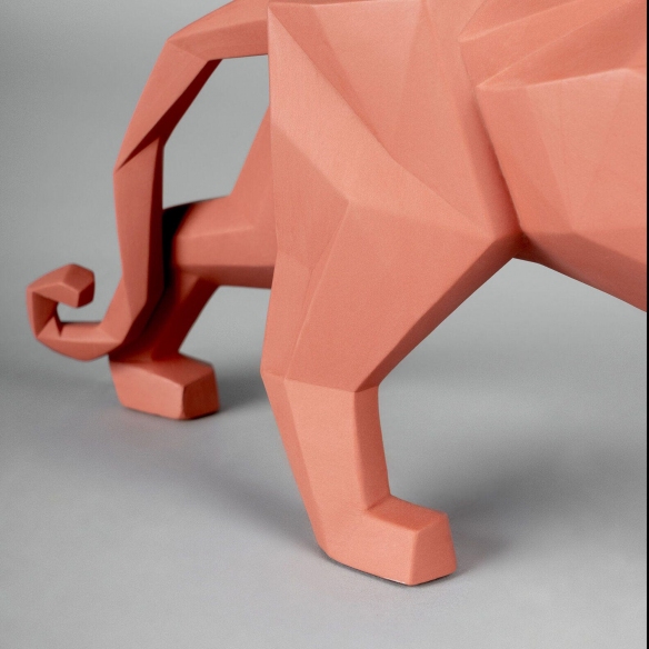 The Panther figurine is an innovative piece from Lladró's Origami collection, crafted entirely in matte porcelain, a material cherished for its elegance and remarkable durability, and adorned with a vibrant shade of coral that lends the figurine an unparalleled style. Drawing inspiration from the Japanese technique of paper folding, this Panther figurine produces a delightful geometric figure; thanks to its innovative style, it harmoniously complements any setting and decor style: whether placed in a bedroom, in a modern-style living room, or in a more classic lounge, this piece will capture the attention of all your guests. Lladró's craftsmanship is highlighted through meticulous attention to detail; each curve has been designed to reflect light differently, bringing the figure to life with subtle shadow play that accentuates the muscle and pride of this magnificent predator. The Panther figurine makes a perfect gift idea for housewarmings or other special occasions. Designed by Marco Antonio Noguerón for Lladró.