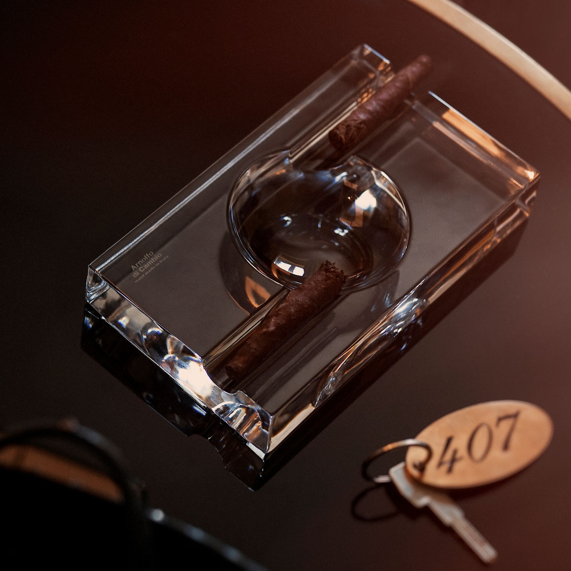 The Montecristo ashtray has been crafted by Arnolfo di Cambio entirely in clear crystal and stands as a true icon of design, ready to add contemporary elegance to any space in your home. This beautiful ashtray will be a valuable addition to a modern-designed home, where it can be displayed as a genuinely charming decorative object in a living room, a home or commercial office, or an entryway; its purpose is to serve on every occasion. Its shape is designed to elegantly accommodate ashes, making it an essential accessory for cigar connoisseurs. The Montecristo ashtray is also a perfect gift idea for all style and design enthusiasts. Purchasing this stunning Montecristo ashtray means choosing a product that is aesthetically refined, functional, and innovative. Designed and engineered by the ADC Technical Office.