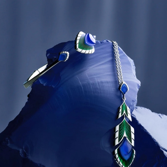 The Paon Cristal Bleu et Laque Verte Pendant is a true masterpiece of jewelry that embodies sophistication and elegance, made by Lalique in crystal and metal. The Paon Pendant is inspired by the creature that symbolizes immortality, renewal, and wealth: the peacock. This animal holds a strong power of allure and romanticism. Lalique delivers a graphic and stylish interpretation of this creature and its fan of iridescent feathers with hypnotic jewelry that highlights the satin-finished crystal carving light, evoking the shades of its majestic plumage. Wearing this stunning pendant means enveloping oneself in an aura of elegance and luxury. It is not just a mere accessory, but a statement of style.