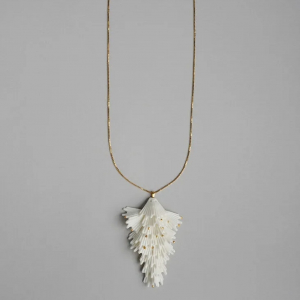 The elongated Actinia pendant is a marvelous piece of jewelry that captures both imagination and attention, crafted by Lladró from matte white porcelain, with a leather back and metal parts in 3-micron gold-plated 925 sterling silver, and designed by the acclaimed jeweler Raluca Buzura. This exquisite pendant is inspired by the incredible diversity and beauty of marine life and can be easily matched with different looks, making it extremely versatile: whether worn to add a touch of elegance to casual attire or as a distinctive complement for more formal occasions, the Actinia will surely stand out. The elongated Actinia pendant is not just an accessory, but a true bridge between marine nature and art that communicates sensitivity and a love for refinement. Designed by Raluca Buzura for Lladró.