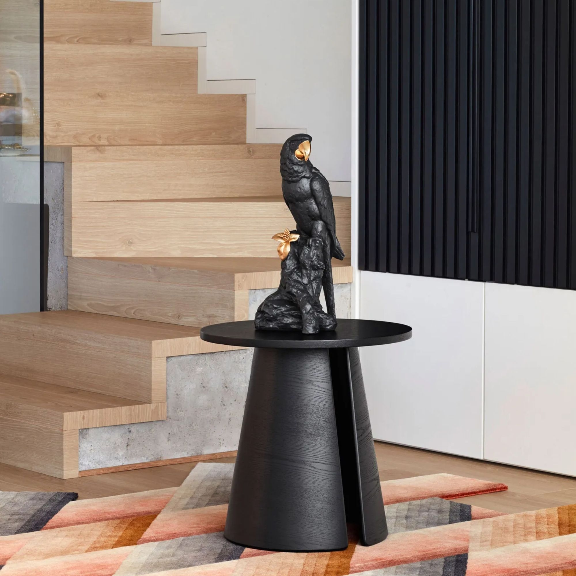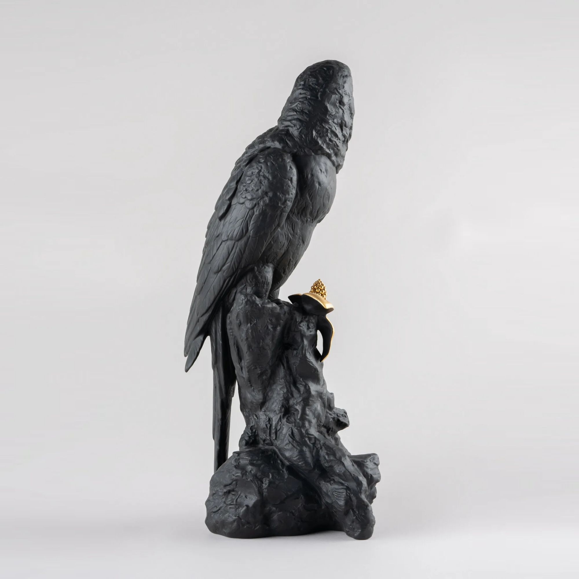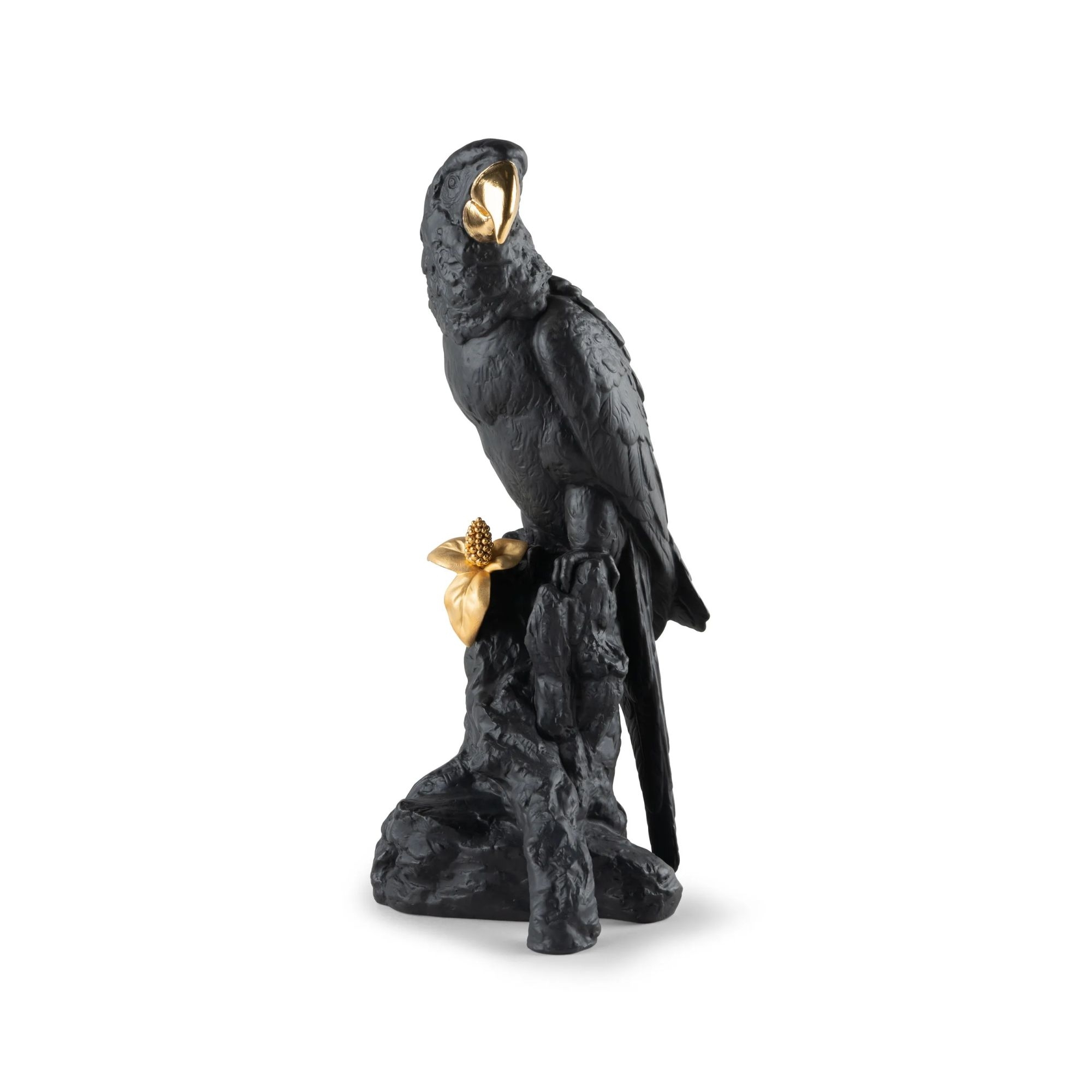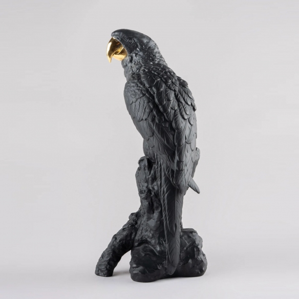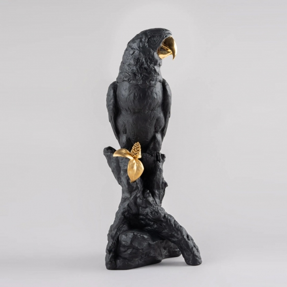 The Ara sculpture is a stunning, limited edition artwork, entirely crafted in porcelain by Lladró, belonging to the Boldblack collection. This magnificent sculpture, in black/gold colors, depicts Ara, one of the most fascinating and elegant tropical parrots. The gold, meticulously applied by master craftsmen, emphasizes the parrot's regality, and the contrast with the deep black highlights the bird's majesty and noble bearing. This sculpture has the ability to embellish any interior: whether placed on a living room shelf, on an office desk, or on a bedroom nightstand, Ara catches the eye. Collectors and art lovers will be delighted to include this exceptional piece in their collections, as it represents the pinnacle of luxury and craftsmanship in porcelain work. Designed by Joan Coderch for Lladró.