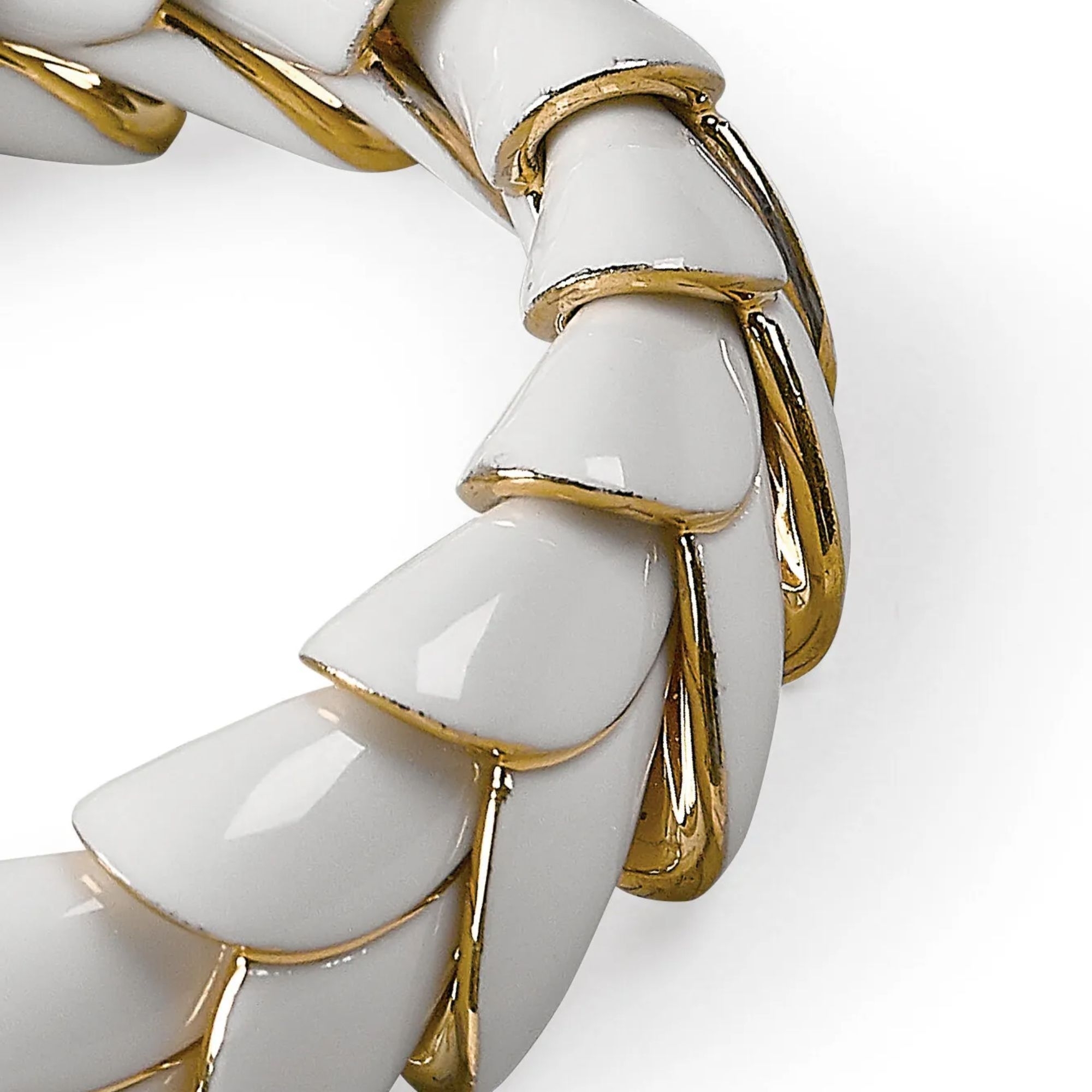 The Heliconia bracelet is a beautiful piece of jewelry made by Lladró in sterling silver with an 18-karat gold plating and white and gold porcelain flowers hand-painted. This splendid bracelet has a design inspired by the delicacy and forms of the tropical Heliconia plant. It is constructed with a sequence of 17 delicate leaves and is elastic to adapt to the size of the wrist, guaranteeing comfort and stability. The bracelet is perfect for women seeking original, elegant, contemporary, and fresh creations, ideal for any occasion.