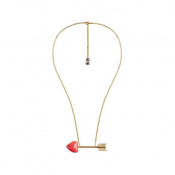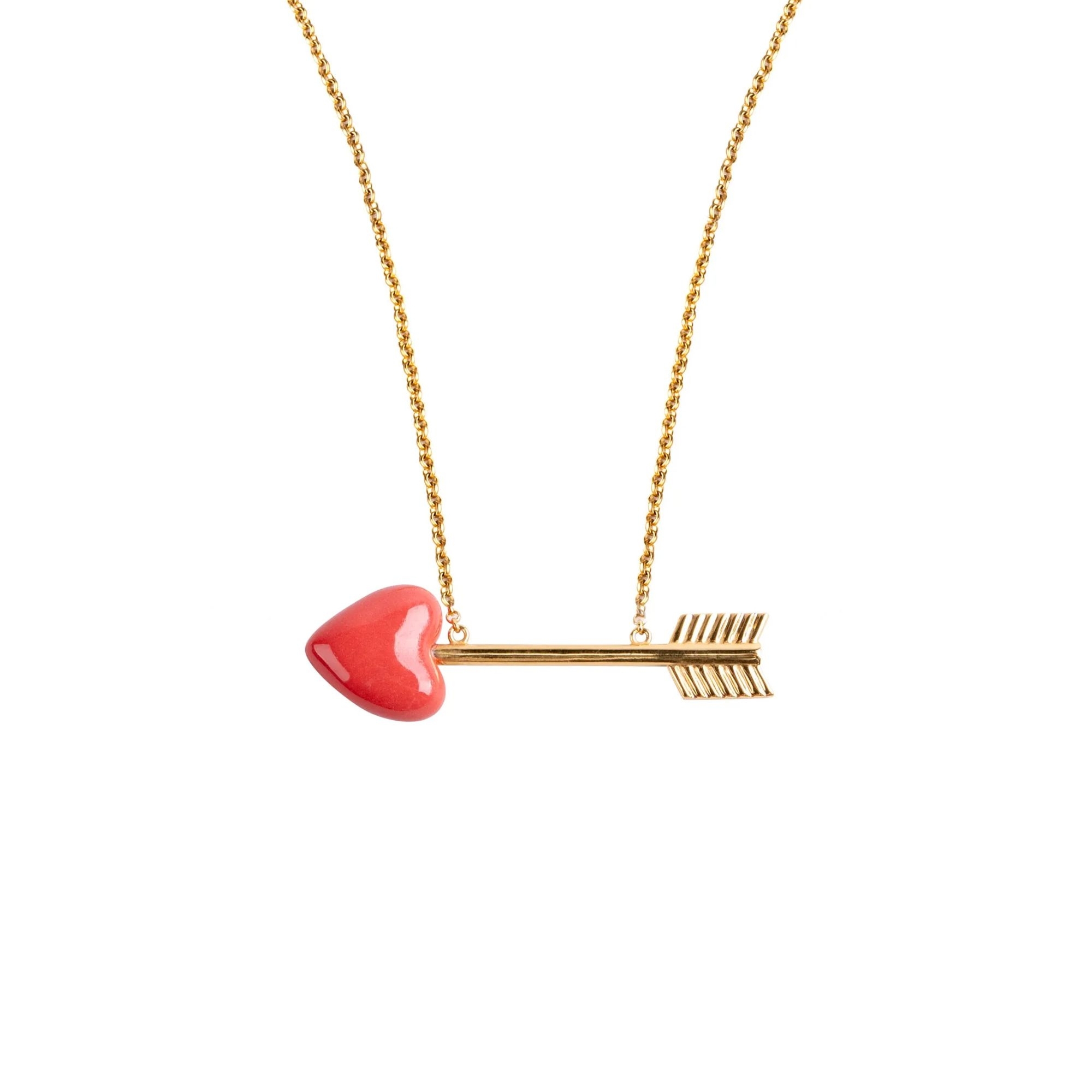 The "Dritto Al Cuore" pendant is a beautiful and romantic piece of jewelry crafted by Lladró. The heart is handmade in porcelain, adorned with a deep red color, while the arrow and chain are made of gold-plated sterling silver. This stunning pendant is inspired by the weapon with which Cupid, the god of love, strikes the hearts of lovers. "Dritto al Cuore" is the perfect gift to celebrate the most powerful and vital of emotions, and to commemorate those unforgettable moments in life where the heart sets the pace. It is a wearable piece of art, a symbol of love that carries with it the unmistakable artistic signature and craftsmanship quality of Lladró. Designed by Susana Rodriguez for Lladró.