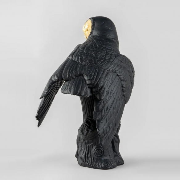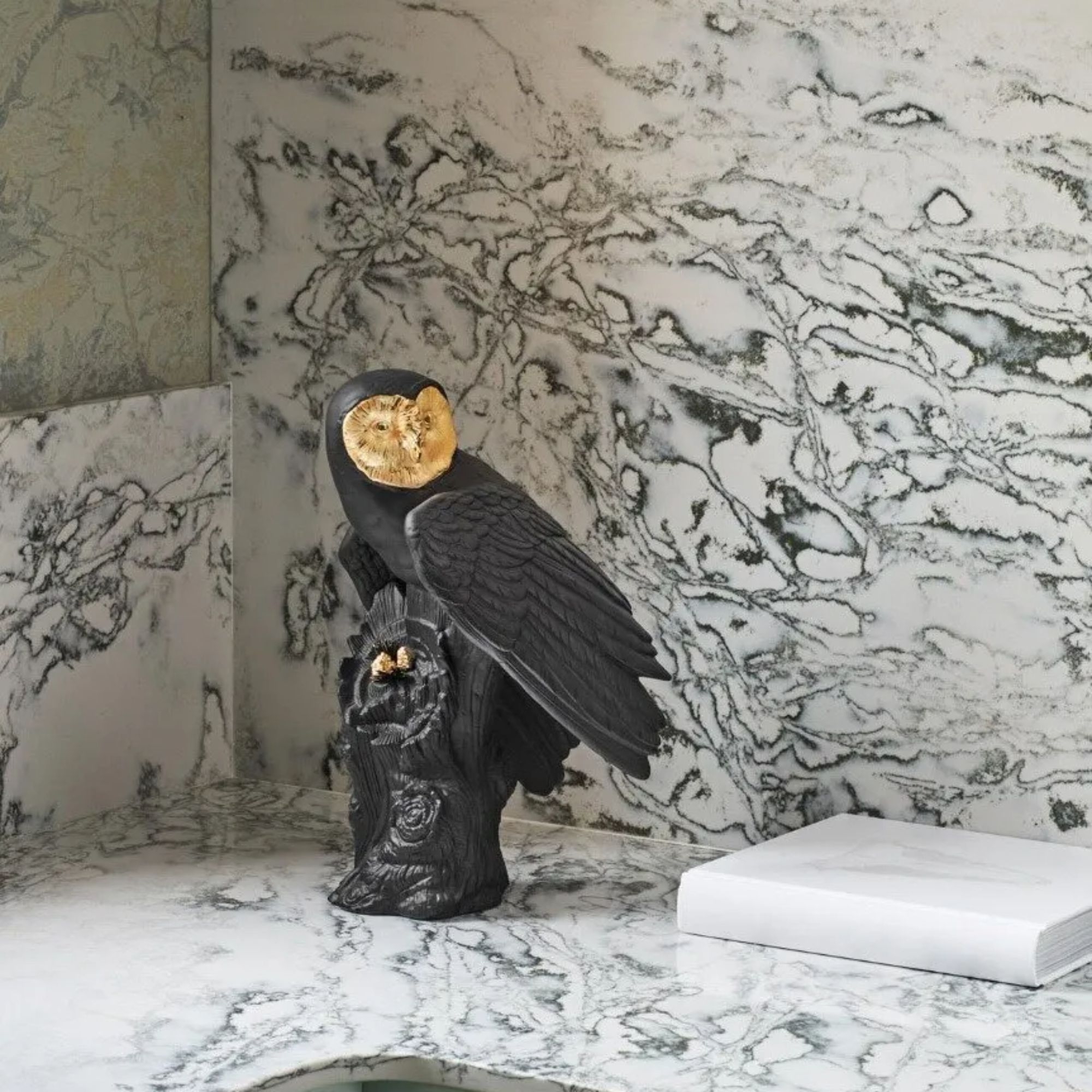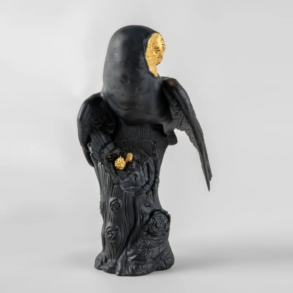 The Black-Gold Owl - Limited Edition sculpture is an exclusive piece of design belonging to the Boldblack collection, merging elegance, mystery, and sophistication, crafted by Lladró in matte black porcelain. This remarkable sculpture symbolizes cunning and intelligence as represented by the emblem of the Greek goddess Athena. Its bold and contemporary design makes it suitable to enhance any room and style of decor: whether placed in a modern living room or in a minimalist office, this sculpture will become the center of conversation among guests. The contrast between black and gold adds a level of mystery and depth, with the intense and mysterious black giving the sculpture an aura of secrecy and shadow; while the glow of gold details highlight the owl symbol, representing wisdom and worth. The Black-Gold Owl sculpture is not just a sophisticated decorative element for interiors, but also stands as a tangible tribute to nature. Created by Regino Torrijos for Lladró.