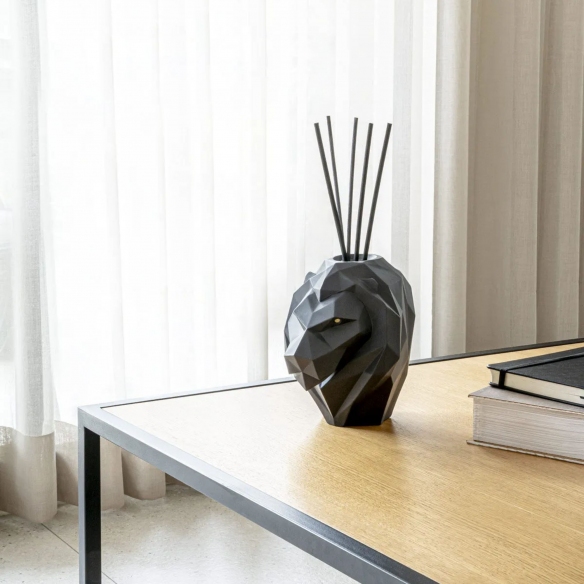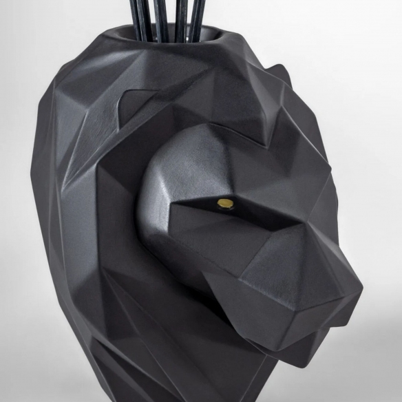 The Lion perfume diffuser (Unbreakable Spirit) crafted in porcelain. Inspired by the Japanese art of origami, this handcrafted porcelain diffuser with a matte black finish transforms any space with its unique design and enveloping fragrance. The powerful shape of the lion's head, a symbol of strength and courage, blends with the geometric aesthetics of origami, creating an item of great sculptural and decorative impact. Perfect for those who wish to add a touch of nobility and a sophisticated atmosphere to their spaces, the Lion perfume diffuser - Unbreakable Spirit is the ideal choice to enrich your home with style and personality.