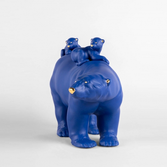The sculpture "Mother Bear and Her Cubs" crafted in porcelain. Featuring the stunning contrast of matte Klein blue and precious gold finishes, this sculpture depicts the imposing figure of the polar bear in a protective embrace with her cubs. A true expression of nobility and delicacy, ideal for those who desire a sophisticated and visually impactful decor element. Bring the beauty of the Arctic lands directly to your home or office with this elegant and majestic porcelain artwork.