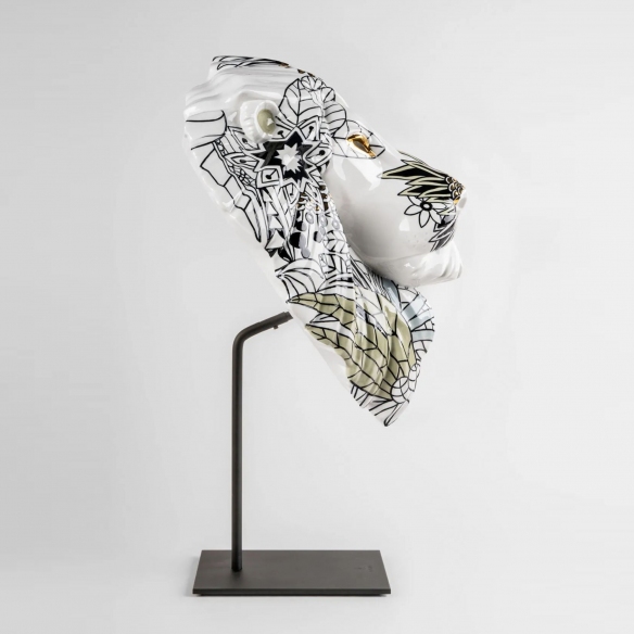 The Lion Mask / Wild Nature sculpture, crafted in porcelain, is inspired by the captivating traditional African masks and belongs to the Fierce Portraits collection. This collection is enriched with a new, stunning masterpiece thanks to the mastery of Lladró's artists, who lead us to the discovery of uncharted territories through this innovative interpretation. The lion mask is adorned with an incredible floral fantasy that renews its character, featuring contemporary design and lines prominently. The white porcelain serves as a canvas, on which black traits and golden details intensely stand out. This piece represents an exceptional example of how traditional art can meet modernity, transforming into a decor element capable of capturing the gaze and enriching any environment with a touch of elegance and mysterious charm.