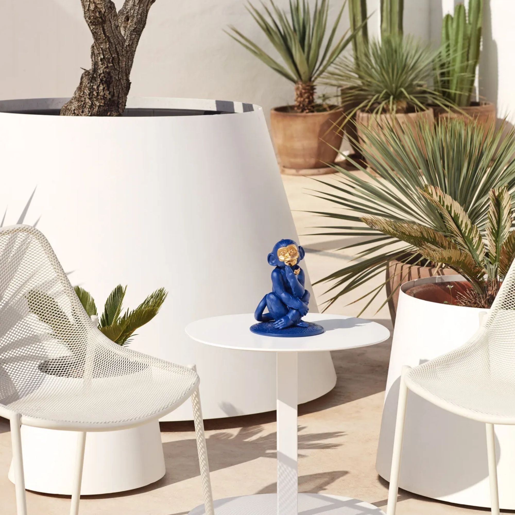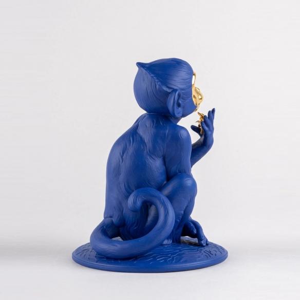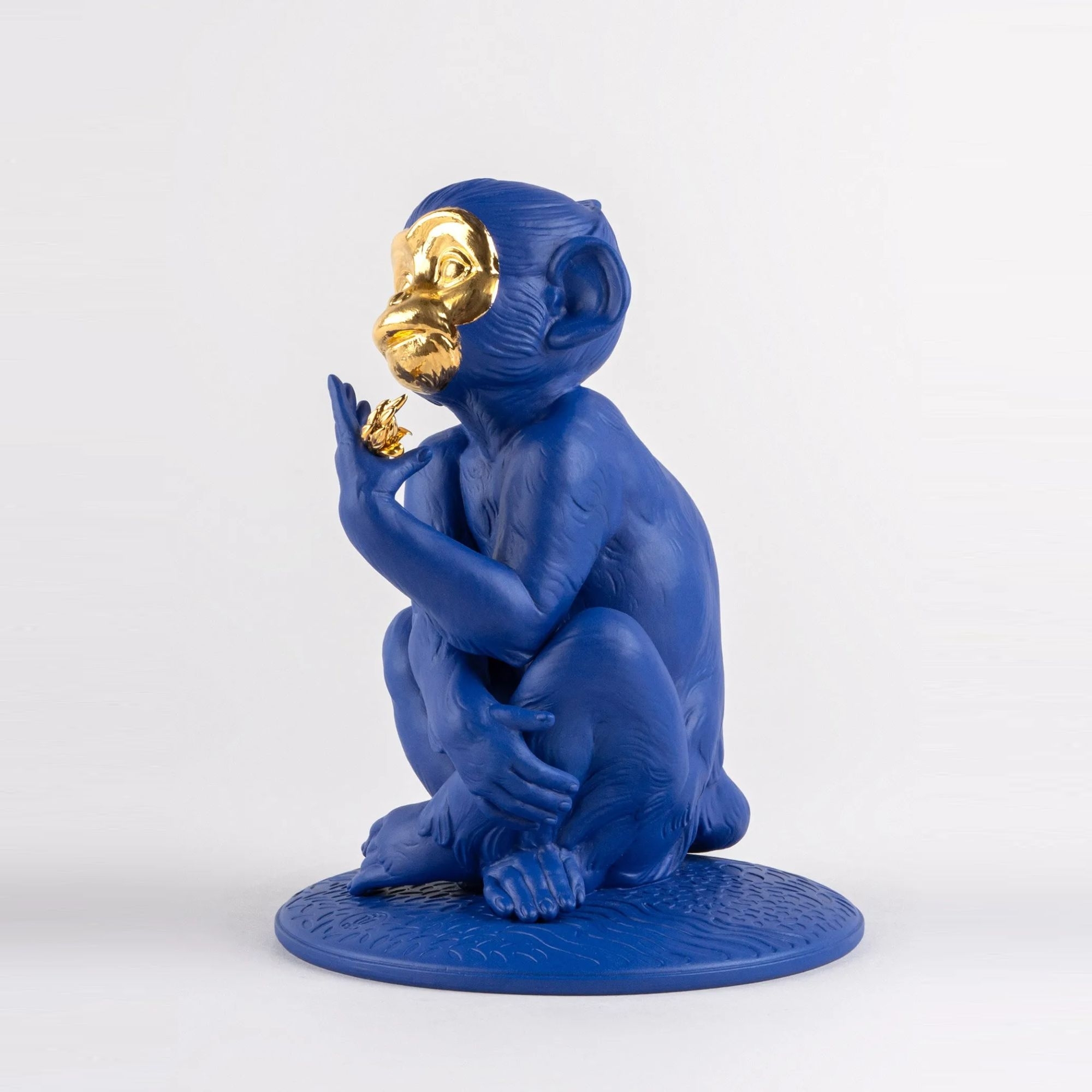 Small Monkey sculpture Blue-Gold made of porcelain. The Small Monkey porcelain sculpture from the Boldblue collection is an artistic statement that challenges the boundaries of the traditional. With its vibrant blue color and gold details, this little monkey does not go unnoticed, quickly becoming the center of attention in any environment. This piece is dedicated to those who are not afraid to dare and express their personality through unique pieces of furniture. Let yourself be surprised by the dynamism and joy that this sculpture can bring to your life and your home.