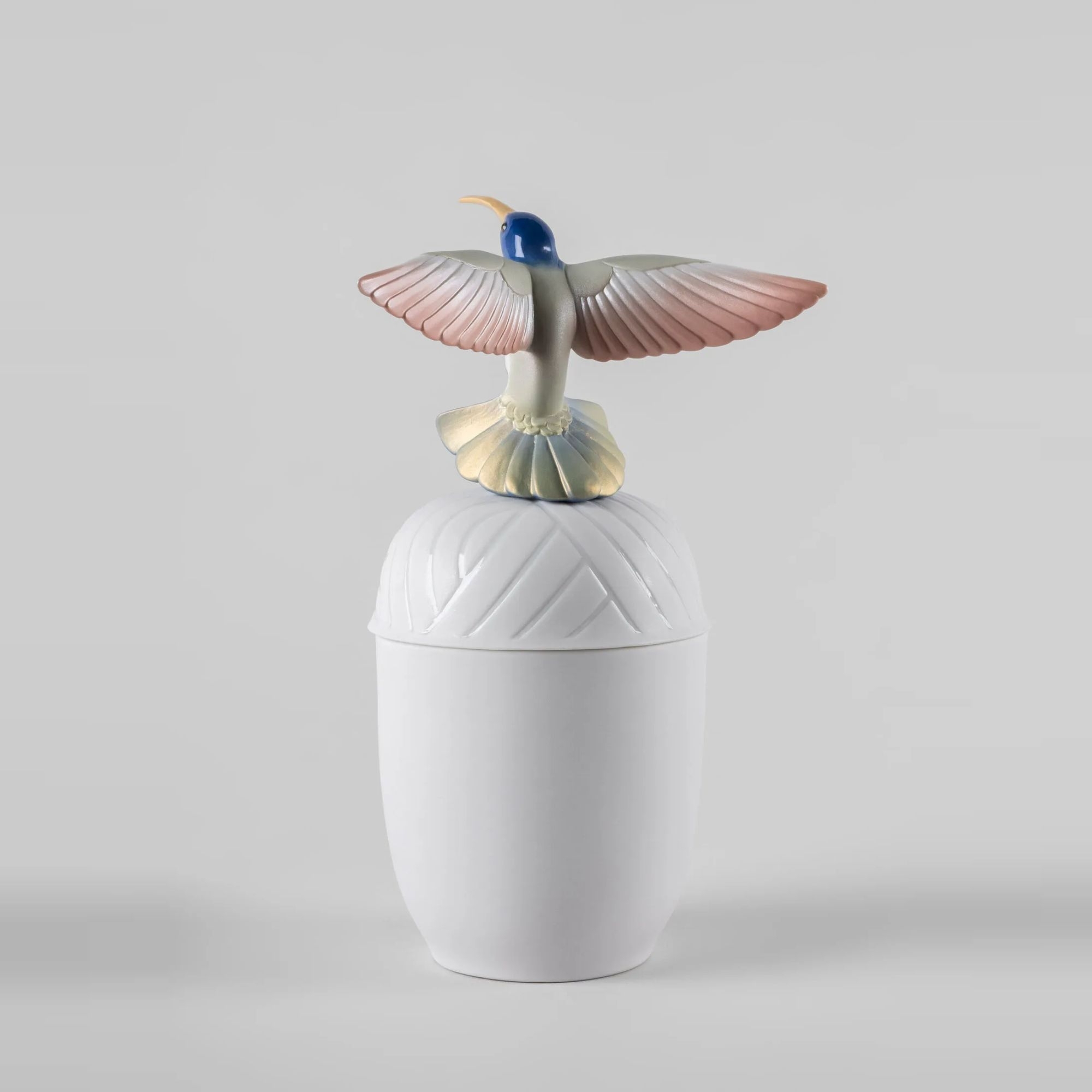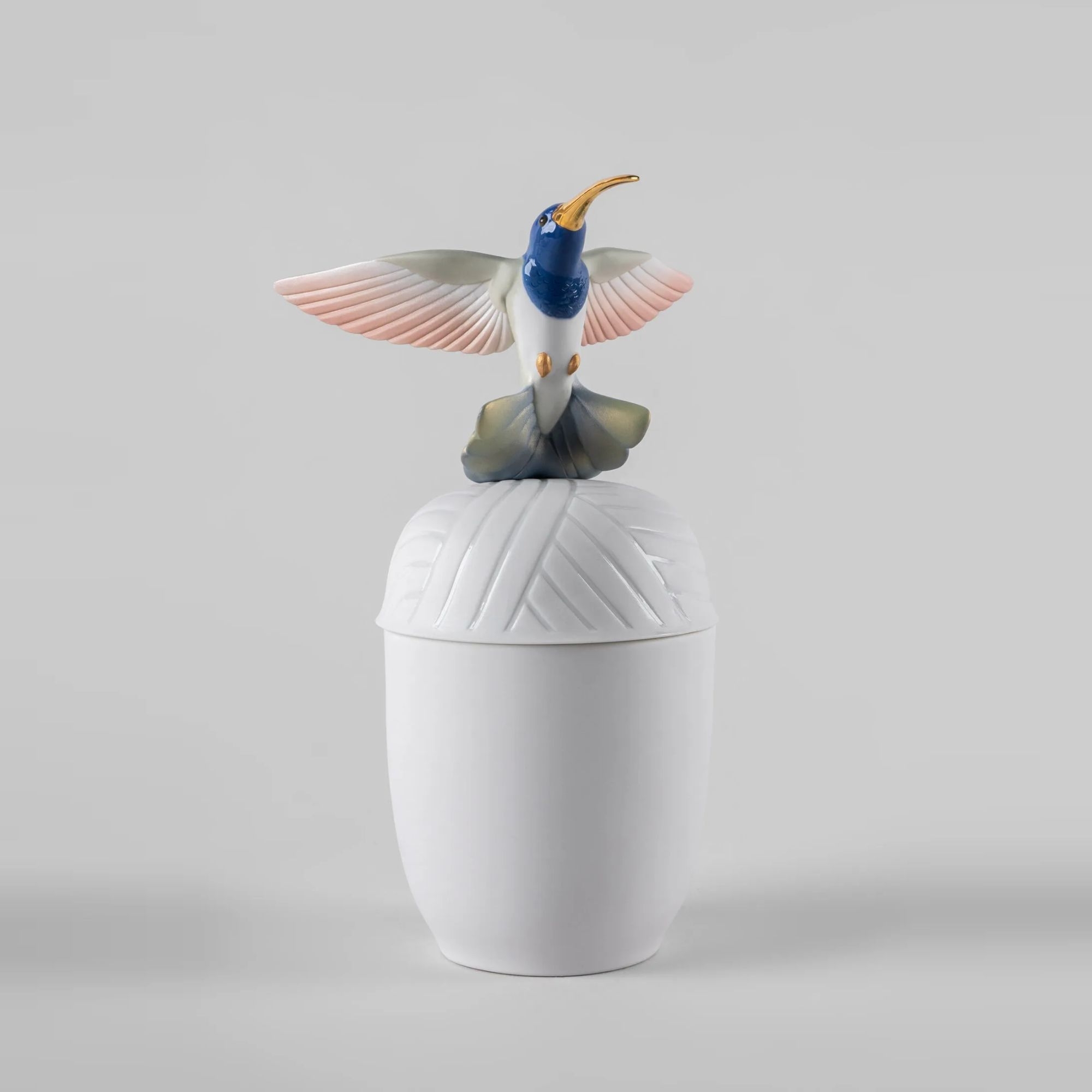 Hummingbird box made of porcelain. Elegant and delicate, this refined casket is crafted from fine porcelain, adorned with a beautiful hummingbird, a symbol of joy and lightness. Its design is not only meant to store your jewelry and small treasures but also to add a touch of elegance and nature to your home. Every detail has been carefully crafted to pay homage to the delicacy and vivacity of the hummingbird, making this casket a truly unique piece. Perfect for those who love to surround themselves with objects that speak of beauty and harmony, the Hummingbird casket successfully combines functionality and aesthetics in a single, charming home accessory.