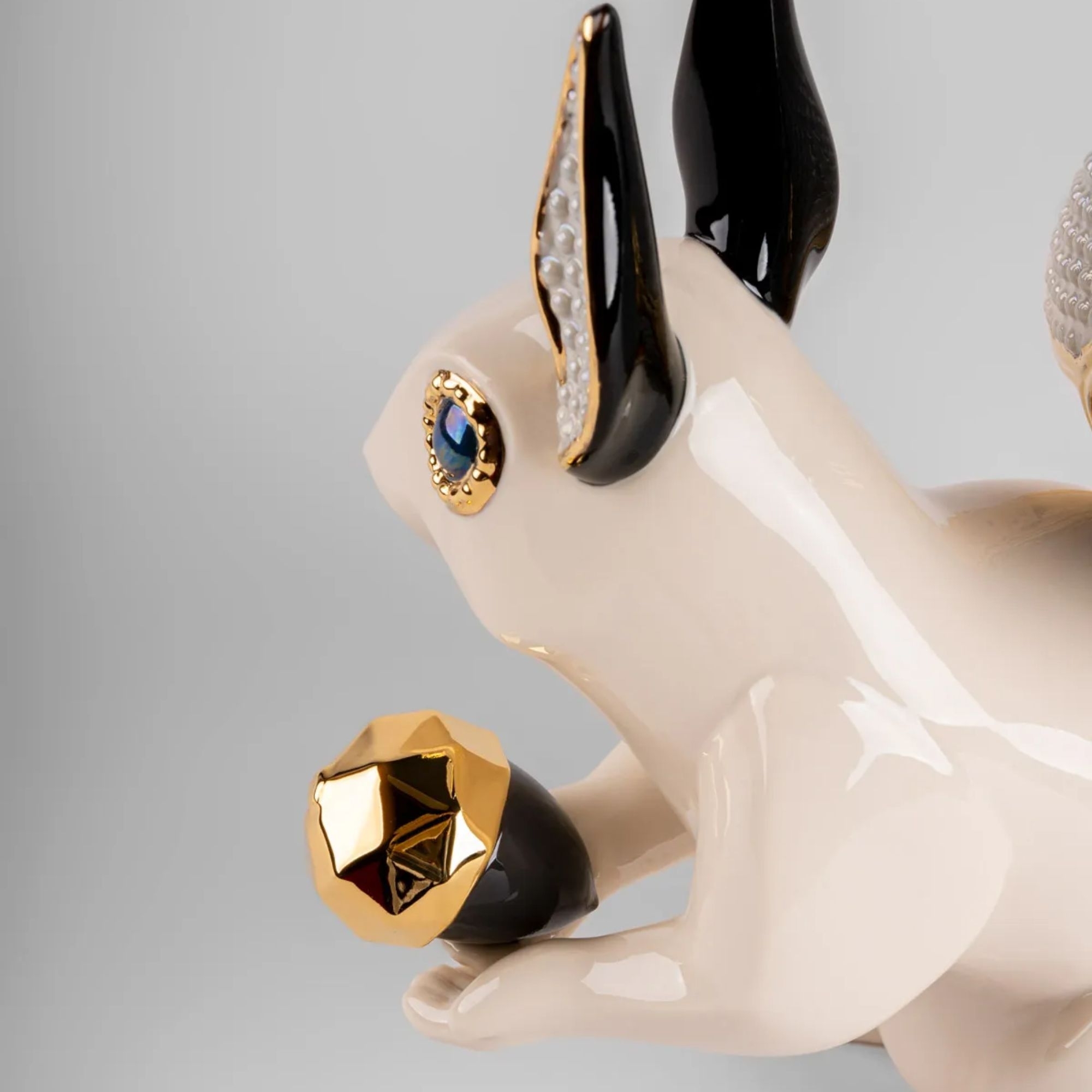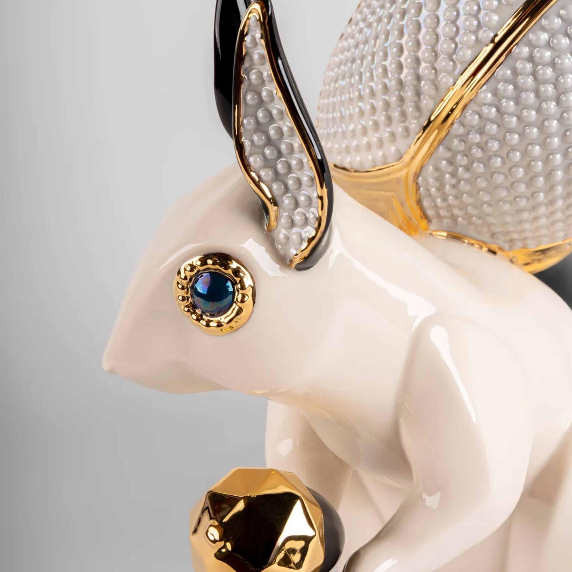 Jewel Squirrel sculpture made of porcelain. This porcelain figure, with its shining and reflective glaze, represents a squirrel in a natural and playful pose that seems almost to come to life. Every detail of the sculpture has been attended to with loving care, from the slight sly smile to the agile paws, to the thick and soft tail that seems to flow like a wave. The use of glazes and authentic colors accurately depicts the classic nuances of the squirrel's fur, giving the piece a pleasantly surprising realism. Ideal as the focal point of a ceramic art collection or as a sophisticated complement in any home setting, this Jewel Squirrel is more than just a representation; it is a symbol of joy and curiosity towards the natural world. Placed on a shelf, a desk, or in a display case, it will catch the eye and become a conversation piece among friends and visitors.