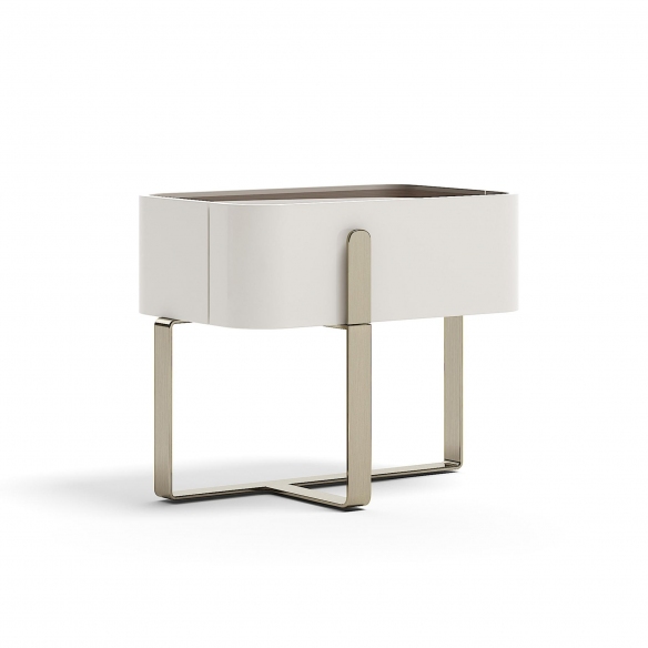 The Eden nightstand, in its large version, features a lacquered structure, a wooden essence top, and metal handle and base. Crafted by Capital, this nightstand is a true masterpiece in the furniture world. Available in various beautiful combinations, the Eden nightstand blends well with different color palettes and decorating styles, naturally complementing beds of different sizes and models. Moreover, the drawer has been designed to offer a storage solution that combines capacity and ease of access, with sliding guides that allow for a smooth and silent movement, ideal for rest areas. Its presence in the room gives it a distinctive character, creating a welcoming and timeless atmosphere. The wide and sturdy surface is perfect for supporting table lamps, books, or various decorative objects that one wishes to keep within reach. Choosing the Eden nightstand, in the large version, means opting for a piece that combines beauty, craftsmanship, and functionality, giving the bedroom an atmosphere of discreet luxury and timeless elegance. Designed by Boatto Martino Studio for Capital.