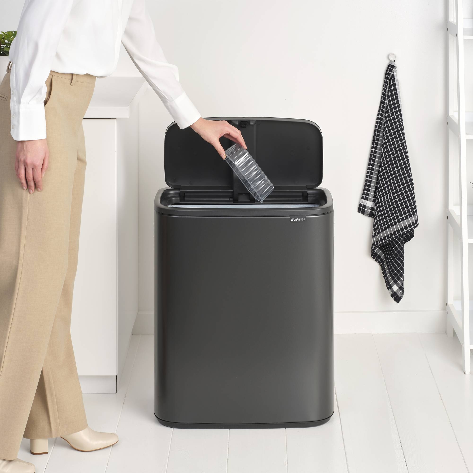 Bo Touch Bin, with a capacity of 60 liters, made with metal structure and removable plastic baskets. Available in 8 elegant and versatile color finishes, the Bo Touch Bin is the ideal accessory for waste separation, thanks to the three internal buckets. It opens with a light touch: opening with the soft-touch system allows you to lift the lid by simply touching it! Adjustable non-slip legs adapt to great stability. Compact and space-saving, the Bo Touch Bin fits easily into any corner of the house! A free pack of PerfectFit pouches is included. Designed and projected by Brabantia.