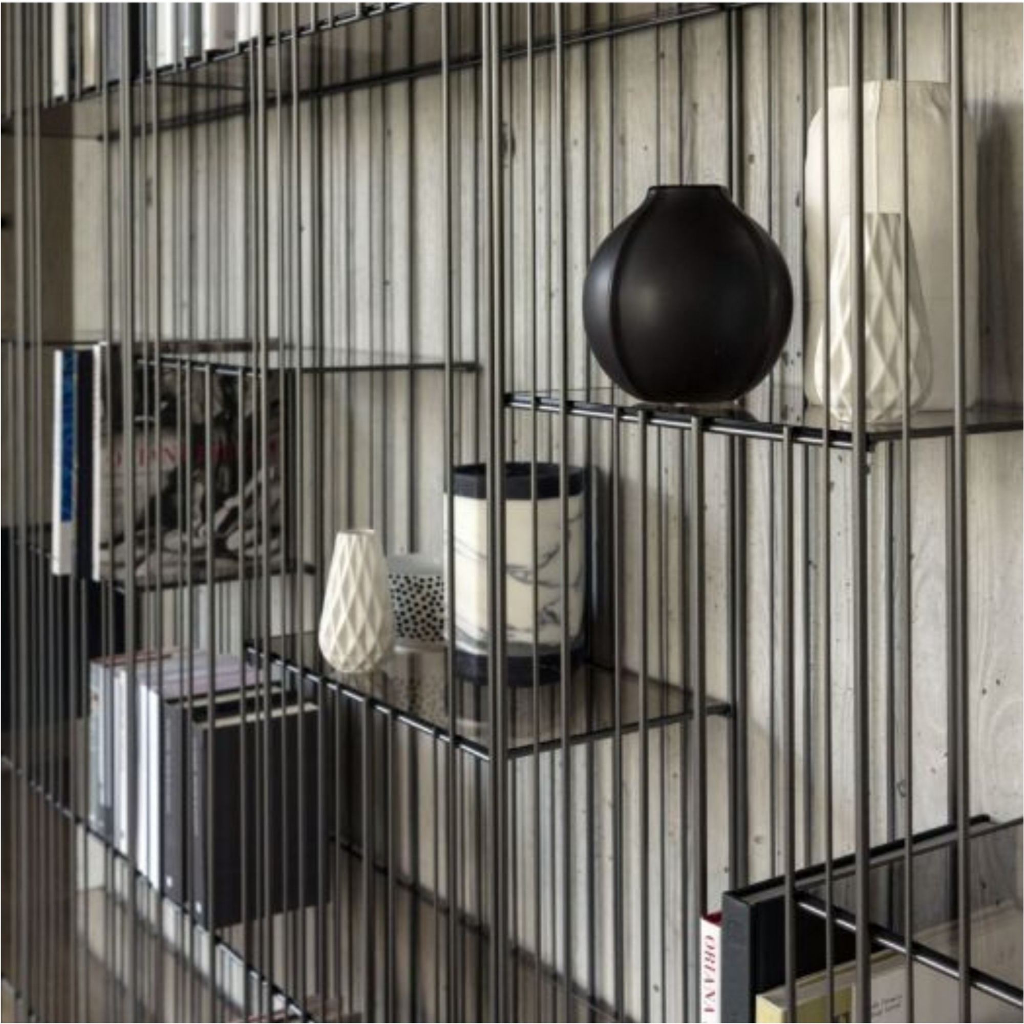 Metrica A bookcase, made with metal structure and crystal shelves. Available in the splendid finishes in burnished, gold and titanium as regards the structure and in green or bronze as regards the shelves, Metrica is a bookcase with a simple design: the rhythm is marked by iron rods fixed at different intervals, on a structure rigorous, ready to be filled with books and objects. Ideal for furnishings with a contemporary taste, Metrica is preparing to become the protagonist of your living environments. Designed by Ctrlzak for Mogg.