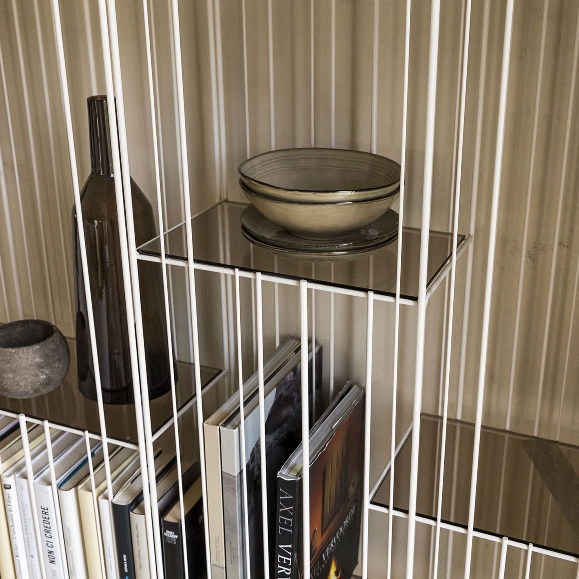 Metrica A bookcase, made with metal structure and crystal shelves. Available in the splendid finishes in burnished, gold and titanium as regards the structure and in green or bronze as regards the shelves, Metrica is a bookcase with a simple design: the rhythm is marked by iron rods fixed at different intervals, on a structure rigorous, ready to be filled with books and objects. Ideal for furnishings with a contemporary taste, Metrica is preparing to become the protagonist of your living environments. Designed by Ctrlzak for Mogg.