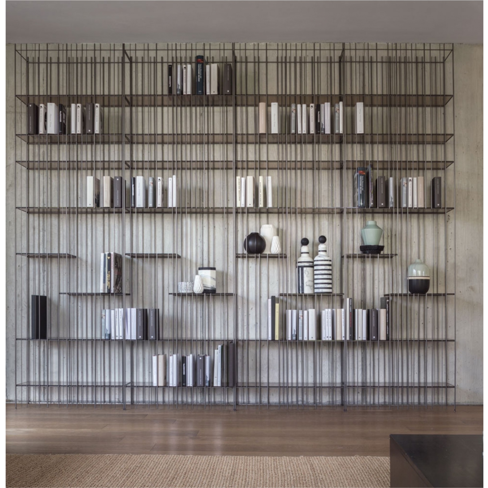 Metrica A bookcase, made with metal structure and crystal shelves. Available in the splendid finishes in burnished, gold and titanium as regards the structure and in green or bronze as regards the shelves, Metrica is a bookcase with a simple design: the rhythm is marked by iron rods fixed at different intervals, on a structure rigorous, ready to be filled with books and objects. Ideal for furnishings with a contemporary taste, Metrica is preparing to become the protagonist of your living environments. Designed by Ctrlzak for Mogg.