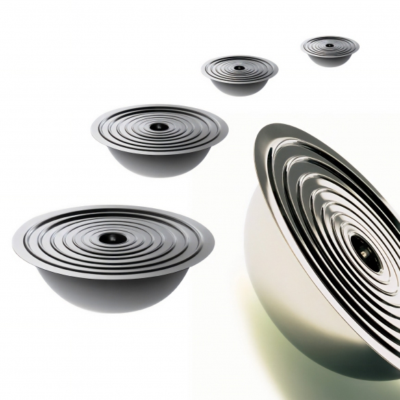 The Planetarium bowls, of various diameters, are made by Serafino Zani in stainless steel, a material admired and perfect for kitchen utensils because it guarantees resistance, sturdiness, and ease of cleaning. These 8 bowls combine with each other to form a single object that becomes a centerpiece, thus saving precious space in the kitchen. Depending on the user's needs, the Planetarium bowls have various uses: the smallest acts as an egg holder for breakfast, the larger ones can serve as containers for salad, pasta, fruit salad, and so on. Moreover, the bowls join together to form closed containers so as to be able to preserve food in the refrigerator or to present it on the table; the smaller ones serve as lids for the larger ones. Suitable for both hand washing and dishwasher, these bowls are designed to make maintenance as simple and quick as possible, thus allowing more time for creativity in the kitchen and for sharing meals with family and friends. When stored, the Planetarium bowls form a wonderful sculpture that reminds of Saturn's rings. Purchase this gem by Serafino Zani right here, on Newpop.it! Designed by Liliana Bonomi for Serafino Zani.