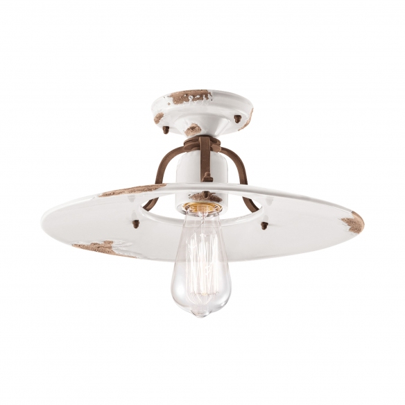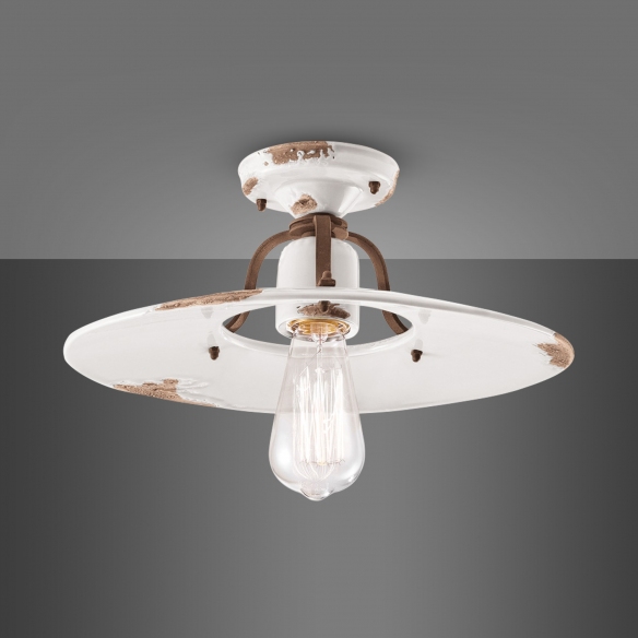 C1445 ceiling lamp made of ceramic with cor-ten antiqued iron frame. Available in different colors to adapt to your style and furnishings, the C1445 ceiling lamp is ideal for lighting a hallway, a living room or an entrance and giving charm to your spaces with a diffuser that recalls the lamps of yesteryear and a rust effect deliberately recreated on the ceramic. Light source 1x77W E27 - IP20. Designed and manufactured by Ferroluce.