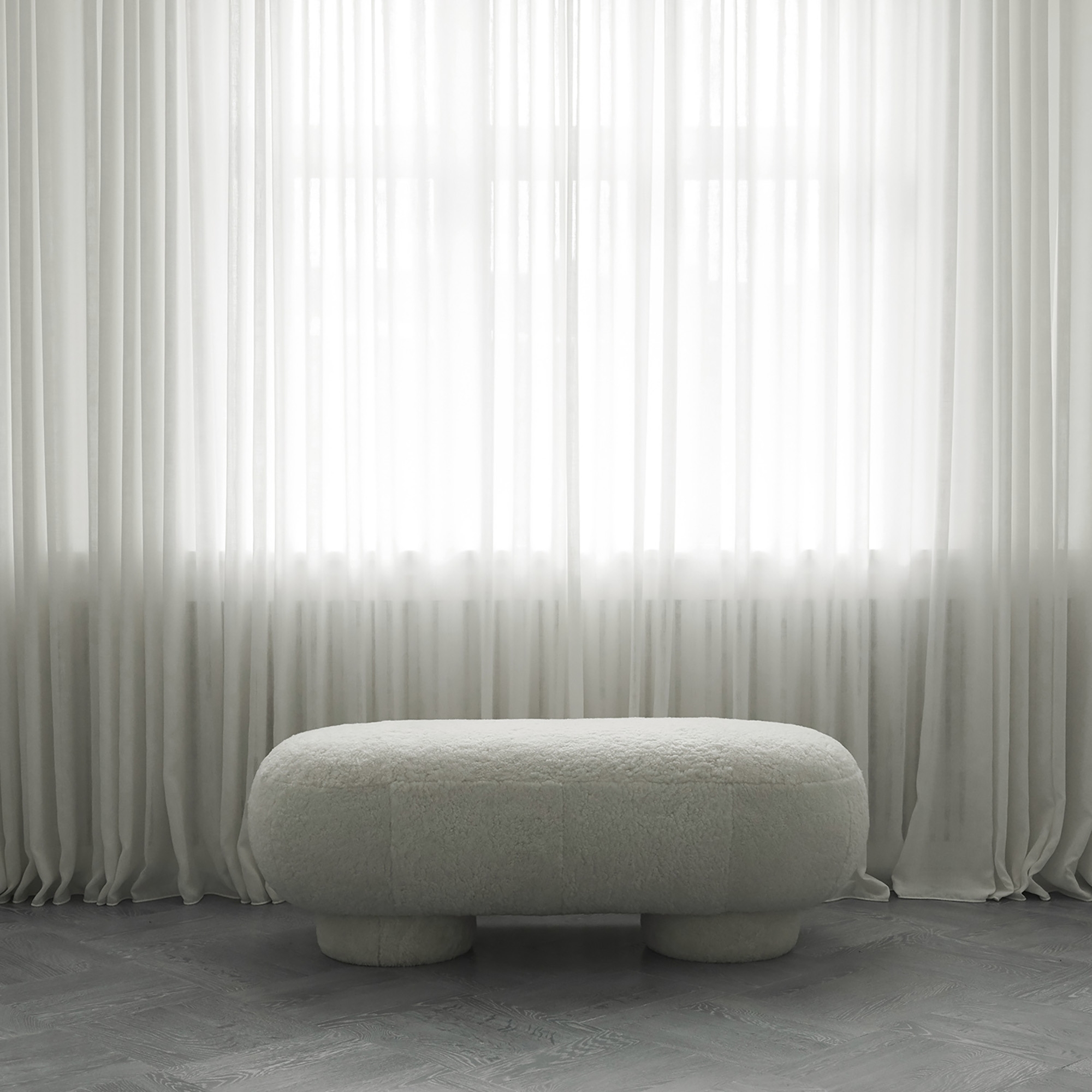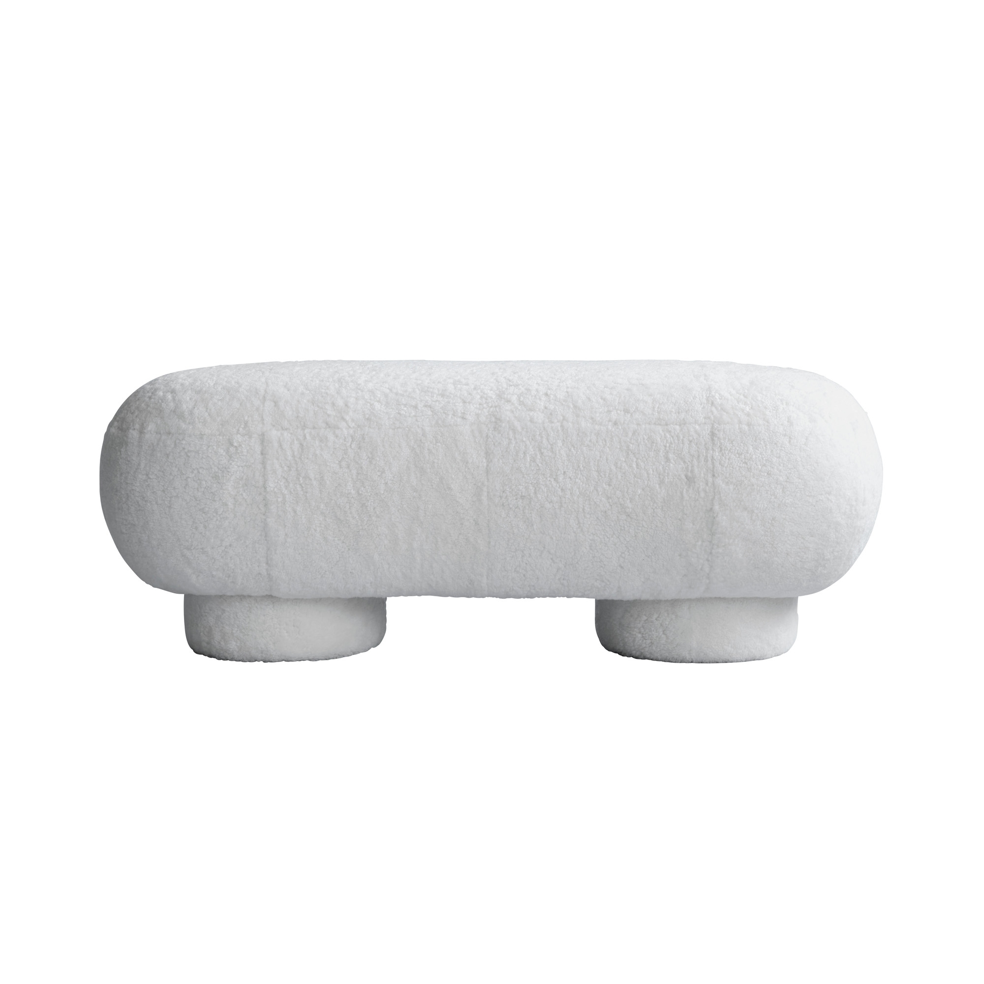 Big Foot Sheepskin bench made of natural off-white sheepskin. Perfect to complete the look of your living room, the Big Foot Sheepskin bench has a modern design and perfect geometries with cylindrical legs and a comfortable seat. Its versatility makes it ideal to use both for decorating and for adding functionality to your interior spaces. Try it together with its coordinated stool. Designed by Kristian Sofus Hansen and Tommy Hyldahl for 101 Copenhagen.