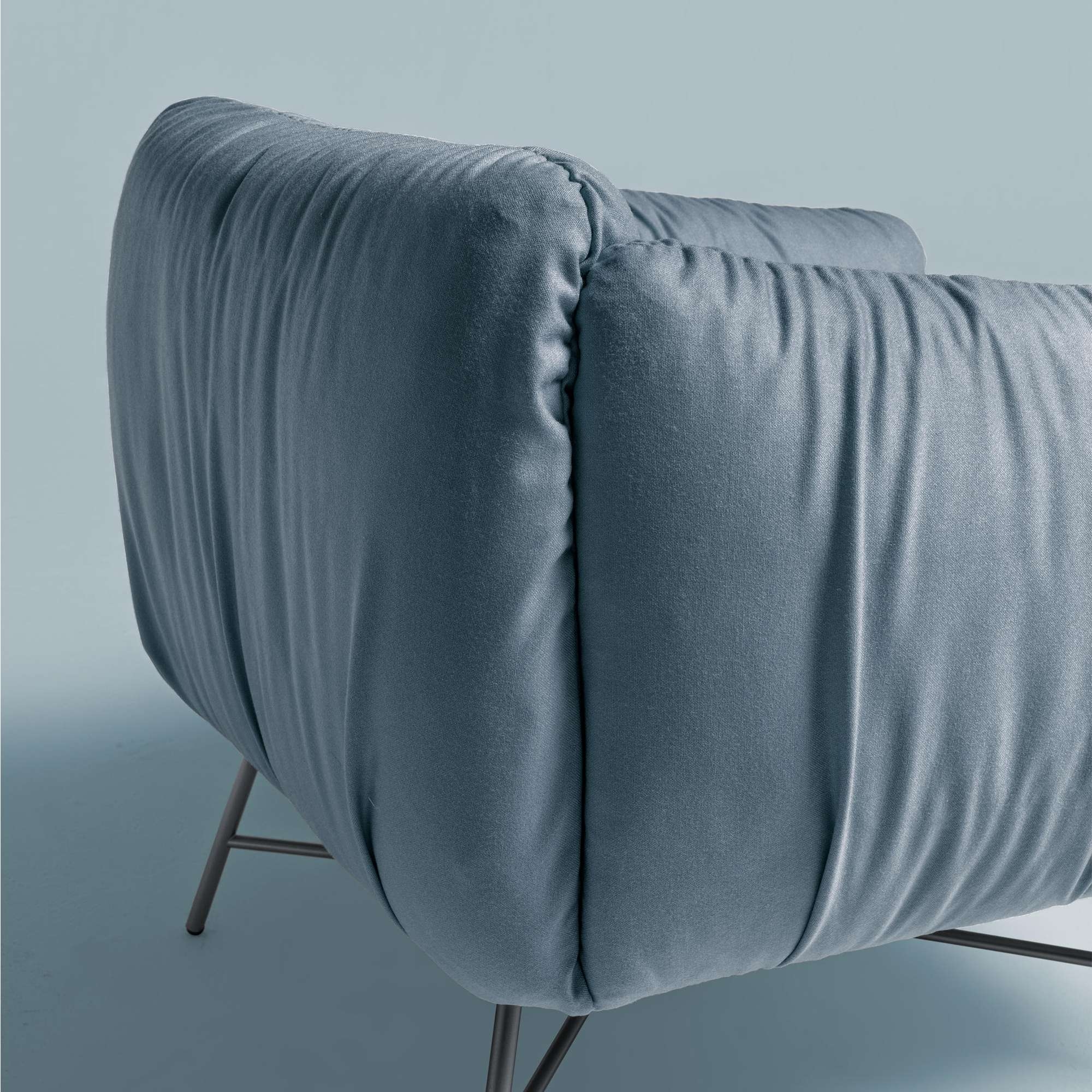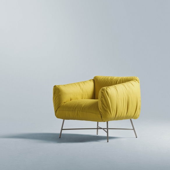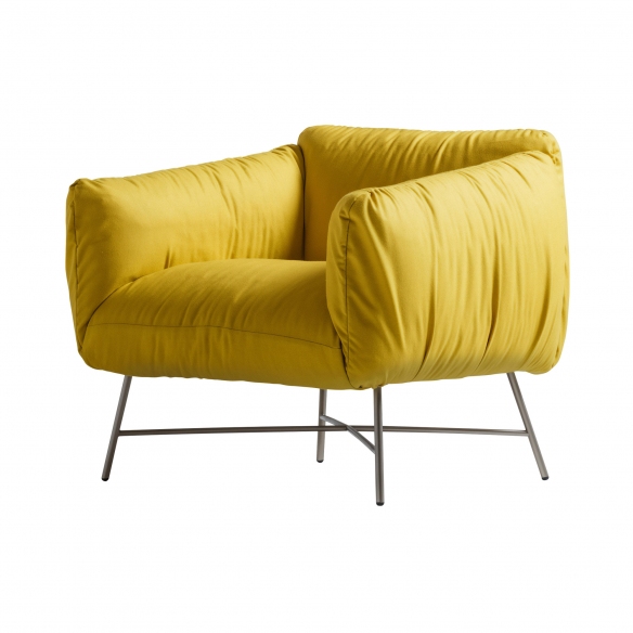 Jolie armchair made with wooden structure covered in polyurethane rubber and goose feathers, base in painted steel and upholstery in leather or fabric. Elegant and seductive, the Jolie armchair embodies elegance and comfort in one piece. With its soft lines and fine upholstery, this armchair offers a welcoming and relaxing seating experience. It is the perfect complement to furnish a creative home, adding a touch of originality to any environment, both classic and contemporary. Designed by angelettiruzza for MyHome Collection.