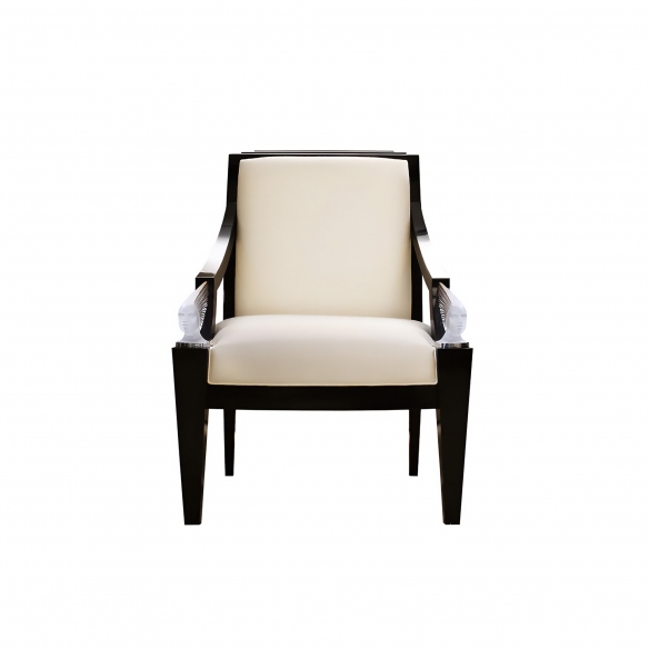 Questa elegante poltrona fa parte della gamma Lalique Maison disegnata da Tina Green e Pietro Mingarelli. Riecheggia le caratteristiche del movimento Art Déco, care a entrambi i designer: contrasto di colori e materiali, linee minimali, elegante semplicità.