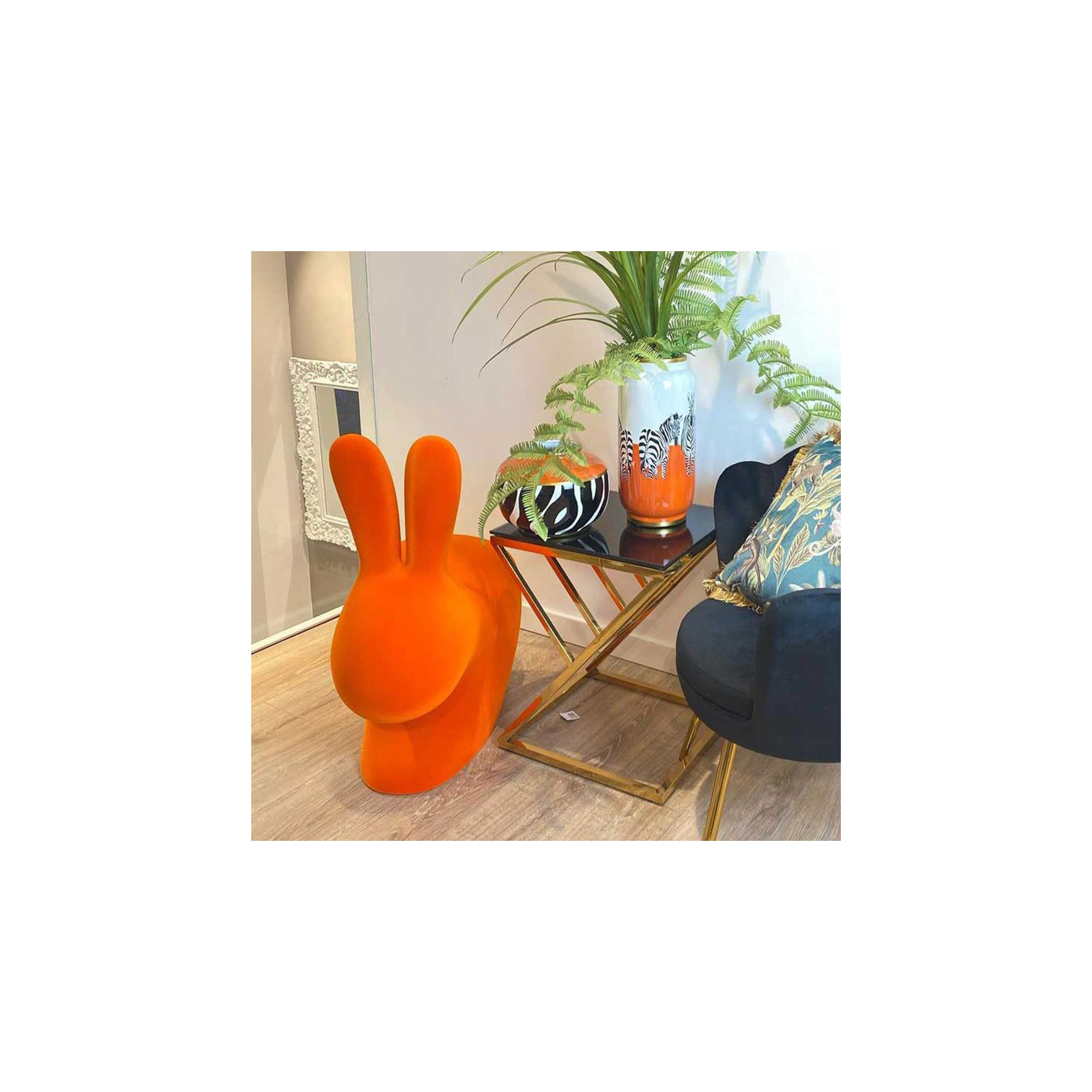 The Rabbit Chair Velvet-finished for children is an unmatched piece of imaginative and creative design, produced by Qeeboo using entirely recyclable polyethylene, a material of the highest quality that ensures durability, resistance, and ease of maintenance and cleaning. This splendid chair is available in six gorgeous colors: dark gold, orange, red, fuchsia, purple, and turquoise, making it suitable for any environment, whether it's a child's bedroom or a living room. Its sinuous shape represents a rabbit, and it can be used by leaning on the ears or on the opposite side, inviting users to recline and relax comfortably. Additionally, the chair is characterized by a velvet surface, providing a soft and inviting feeling to the touch. Give your children a smile with this piece of design. Designed by Stefano Giovannoni for Qeeboo.