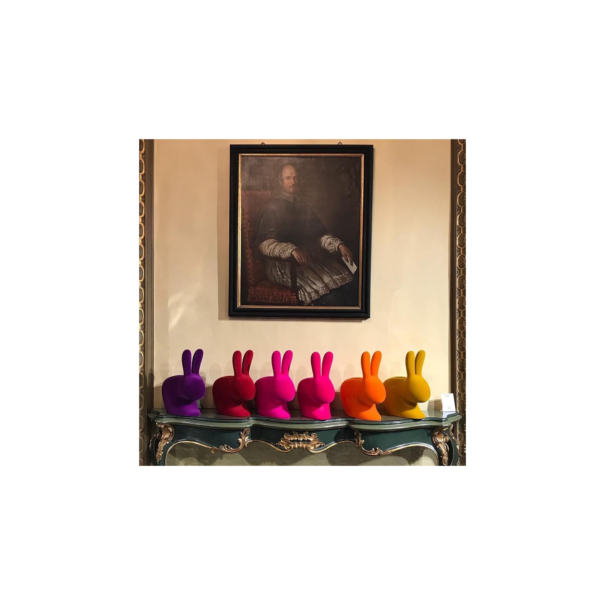 The Rabbit Chair Velvet-finished for children is an unmatched piece of imaginative and creative design, produced by Qeeboo using entirely recyclable polyethylene, a material of the highest quality that ensures durability, resistance, and ease of maintenance and cleaning. This splendid chair is available in six gorgeous colors: dark gold, orange, red, fuchsia, purple, and turquoise, making it suitable for any environment, whether it's a child's bedroom or a living room. Its sinuous shape represents a rabbit, and it can be used by leaning on the ears or on the opposite side, inviting users to recline and relax comfortably. Additionally, the chair is characterized by a velvet surface, providing a soft and inviting feeling to the touch. Give your children a smile with this piece of design. Designed by Stefano Giovannoni for Qeeboo.