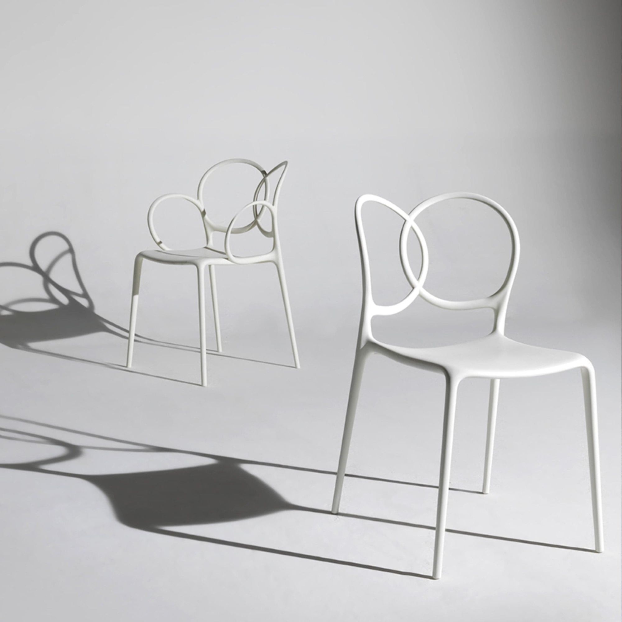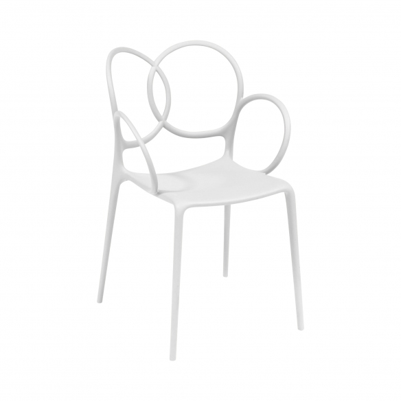 Sissi armchair from the Green Collection, monobloc, made entirely of recycled plastic material. Shown here in white, the Sissi armchair has a sculptural and sophisticated design, perfectly adaptable to contemporary furnishings. The peculiarity of Sissi is in the backrest, very particular and sophisticated, in which two rings merge and seem to be folded by hand. Very refined and delicate, Sissi will give a strong character to your furnishings. Compared to the normal version, Sissi Green Collection is an eco-friendly version, obtained from recycled materials such as PET bottles and containers: an important attention to the environment! Designed by Ludovica + Roberto Palomba for Driade.