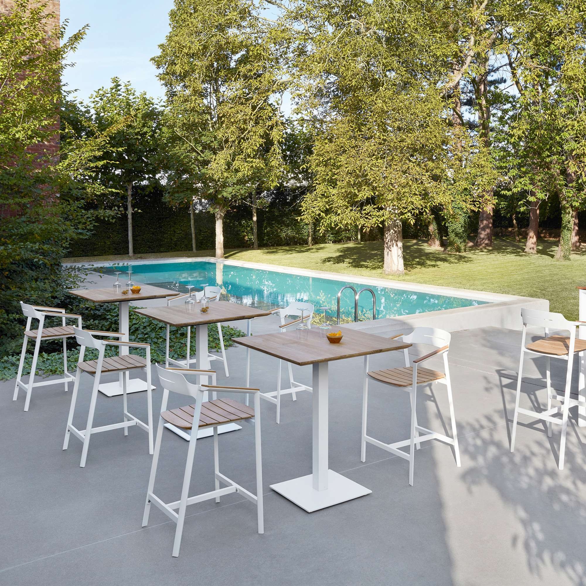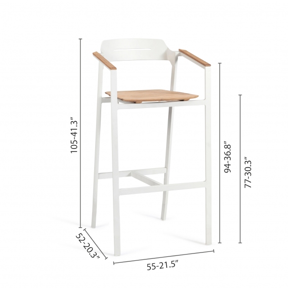 The Icon barstool, with a height of 77.5 cm, is a wonderful jewel made of robust and lightweight aluminum that facilitates movement, and of precious Teak wood that ensures resistance to various climatic changes such as rain, humidity, and UV rays, therefore perfect for outdoor use. Available in four different and beautiful colors, the Icon barstool has clean and minimalist lines, and harmoniously adapts to any type of decor and style, from a rustic and natural garden to a more modern terrace. The height of 77.5 cm makes it ideal to be placed next to high bars or tables, offering a comfortable seat for socializing outdoors. Comfort for the Icon barstool is a priority: this design piece features an integrated footrest to support a pleasant seat for extended periods. Furthermore, the Teak finish combined with powder-coated aluminum adds a warm and natural touch to the environment and makes it perfectly matchable with dining tables with Teak finish. Choose the Icon barstool with a height of 77.5 cm, and it will become a must-have for your limitless comfort.