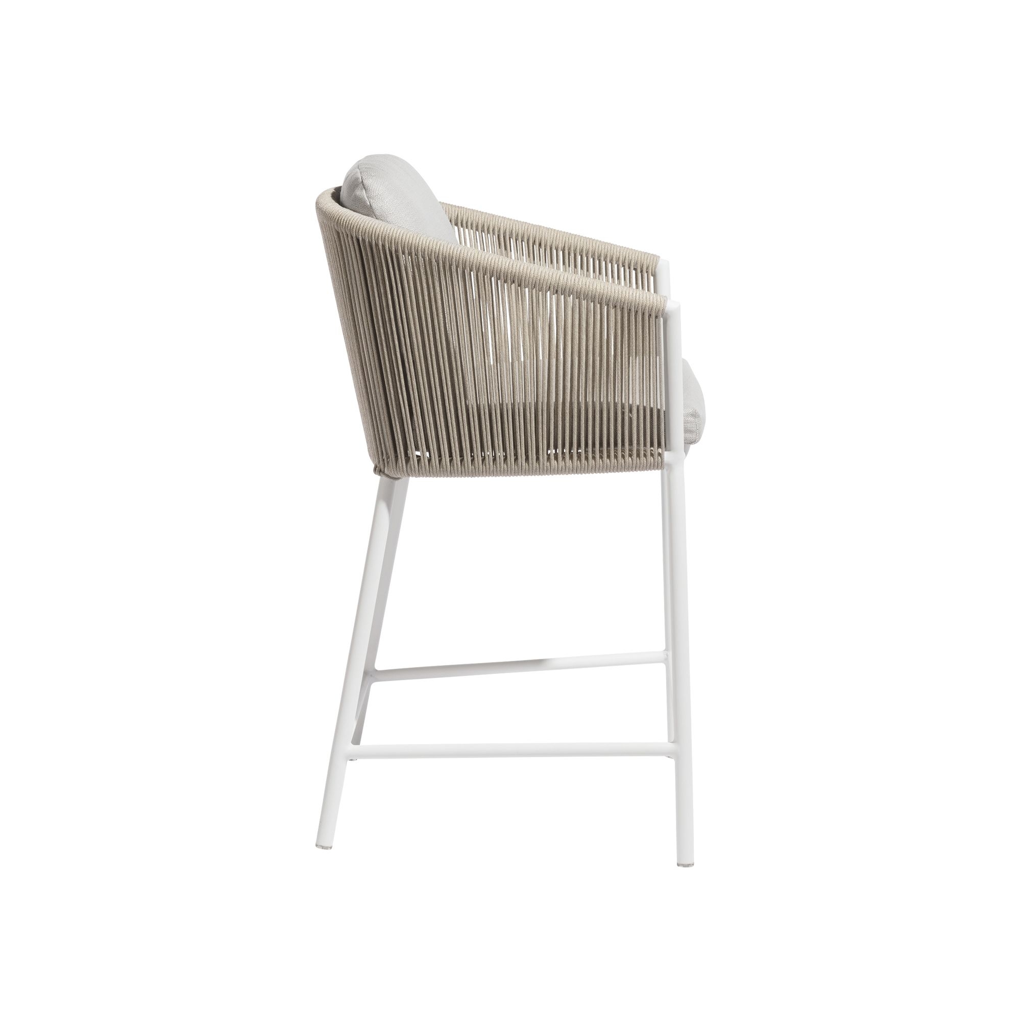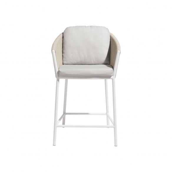 The Omer barstool, standing at 60.5 cm, crafted by Diphano with high-quality materials, combines weather-resistant fabric that withstands rain and UV rays, a rope-detailed backrest that adds a touch of sophistication, and metal, ensuring unparalleled product durability. This outdoor barstool is available in two wonderful colors and features a minimalist design with clean lines, making it perfectly adaptable to any décor style, from a rustic or traditional garden to a vast ultra-modern terrace. The seat guarantees maximum relaxation even during extended use; the integrated footrest provides additional support, making the Omer barstool the perfect accompaniment for both solitary relaxation moments and convivial gatherings with friends and family. A special feature of this outdoor barstool is the backrest's rope finish, which adds comfort and elegance. Whether enhancing the ambiance of a bar, a garden, or a patio, the Omer barstool, at 60.5 cm, stands out for its undisputed ability to merge beauty, functionality, and innovation.