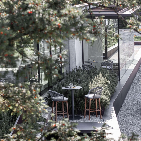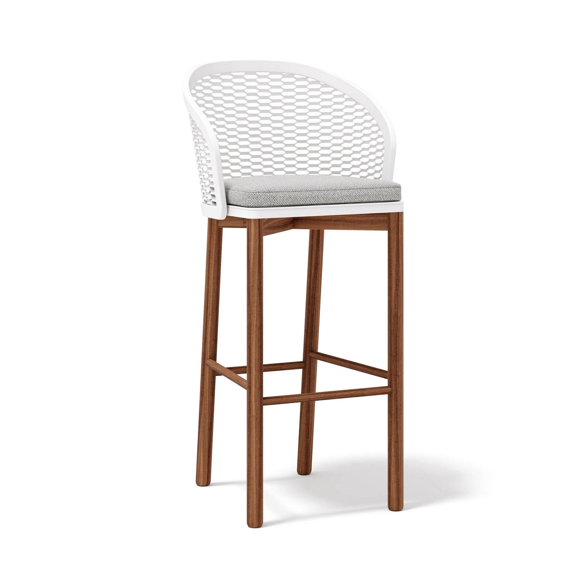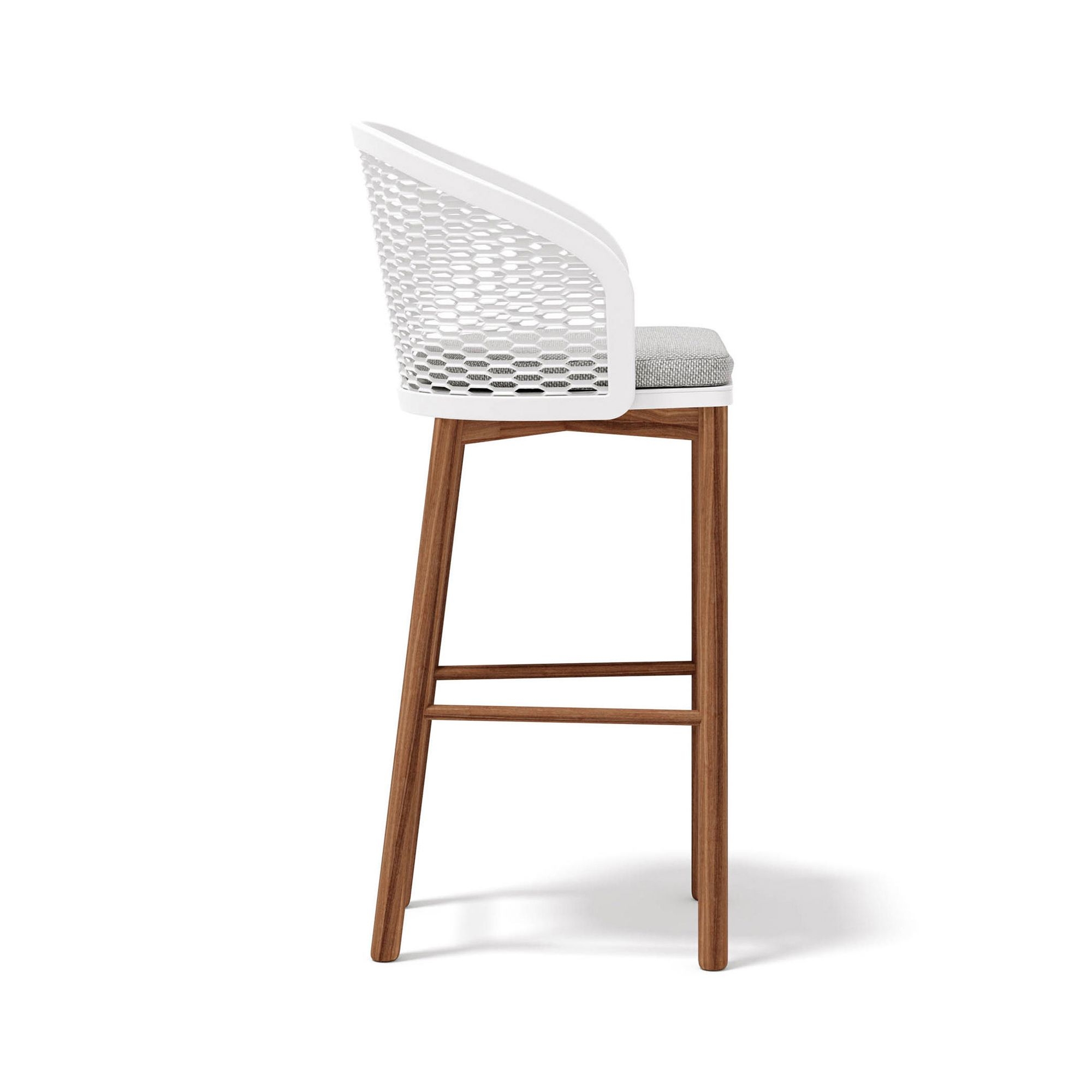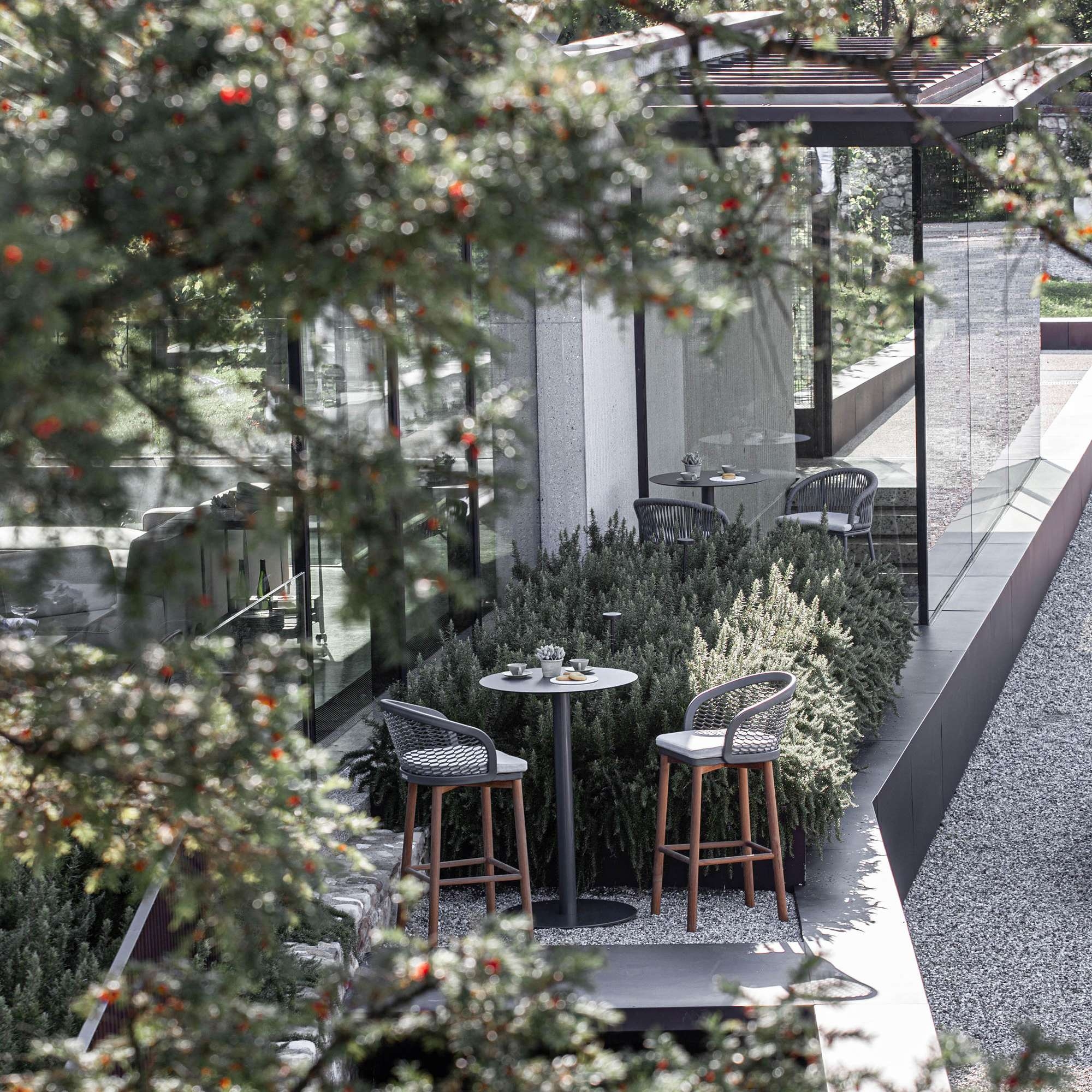Cyrano outdoor stool made with aluminum shell, teak base and seat cushion covered in outdoor fabric. Available in a vast combination of colours, the Cyrano outdoor stool is an elegant reinterpretation of style and comfort in a modern key and designed to enrich any outdoor environment with refinement. Characterized by a sturdy aluminum structure, which guarantees durability and resistance to various atmospheric conditions, this stool stands out for its seat cushion covered in a high-quality outdoor fabric, ensuring maximum comfort even in open spaces. Available in a wide range of color combinations, the Cyrano outdoor stool is the perfect fusion of opulence and functionality, designed to meet and exceed the expectations of the most discerning design lovers. More than a simple piece of furniture, this stool pays homage to the adventurous and romantically fervent existence of Cyrano de Bergerac, expressing a bold and at the same time poetic character. With a design that enhances the audacity of a noble warrior combined with the sweetness of a poet, the Cyrano outdoor stool features elegant and sophisticated details, in a harmonious coexistence between material substance and clean, captivating lines. The enveloping and safe aluminum structure is designed to offer an island of comfort, thanks also to ergonomic cushions designed to guarantee maximum support and comfort while relaxing in the open air. Designed by Atmosphera Creative Lab.