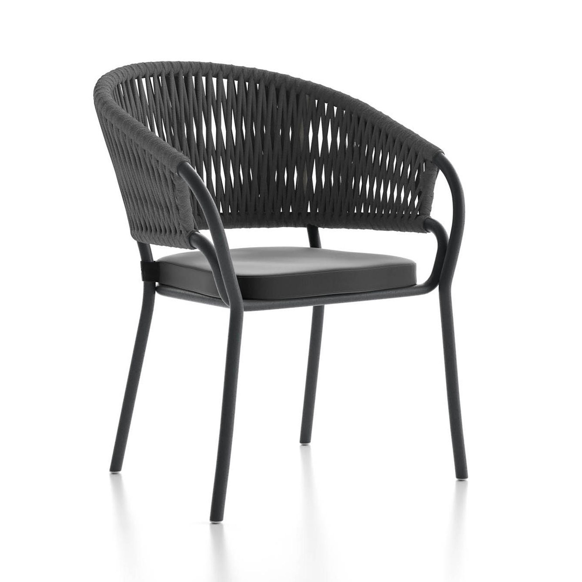The Pleasure 2.0 outdoor chair is crafted with a structure in either white or graphite aluminum, enveloped in an interwoven texture of ropes that mimic textile fibers, and features a seat cushion covered in outdoor fabric. Compact and stylish, the Pleasure 2.0 outdoor chair achieves the perfect balance between refined design and comfort. Its sturdy structure and high-quality materials ensure durability and weather resistance, making it an ideal choice for furnishing your garden or terrace. Perfect for those who seek to blend elegance with functionality, the Pleasure 2.0 chair invites moments of true relaxation under the open sky. Suitable for intimate gatherings or enjoying a drink at sunset, this chair adds a touch of class and warmth to outdoor living. With Pleasure 2.0, every exterior setting is enriched with style and comfort, reflecting a contemporary aesthetic that does not overlook the importance of well-being. Detailed in its form and elements, the chair is designed to provide an ergonomic and enveloping seat. It also combines easy maintenance with the beauty of an outdoor furnishing designed to last over time. Designed by Atmosphera Creative Lab.