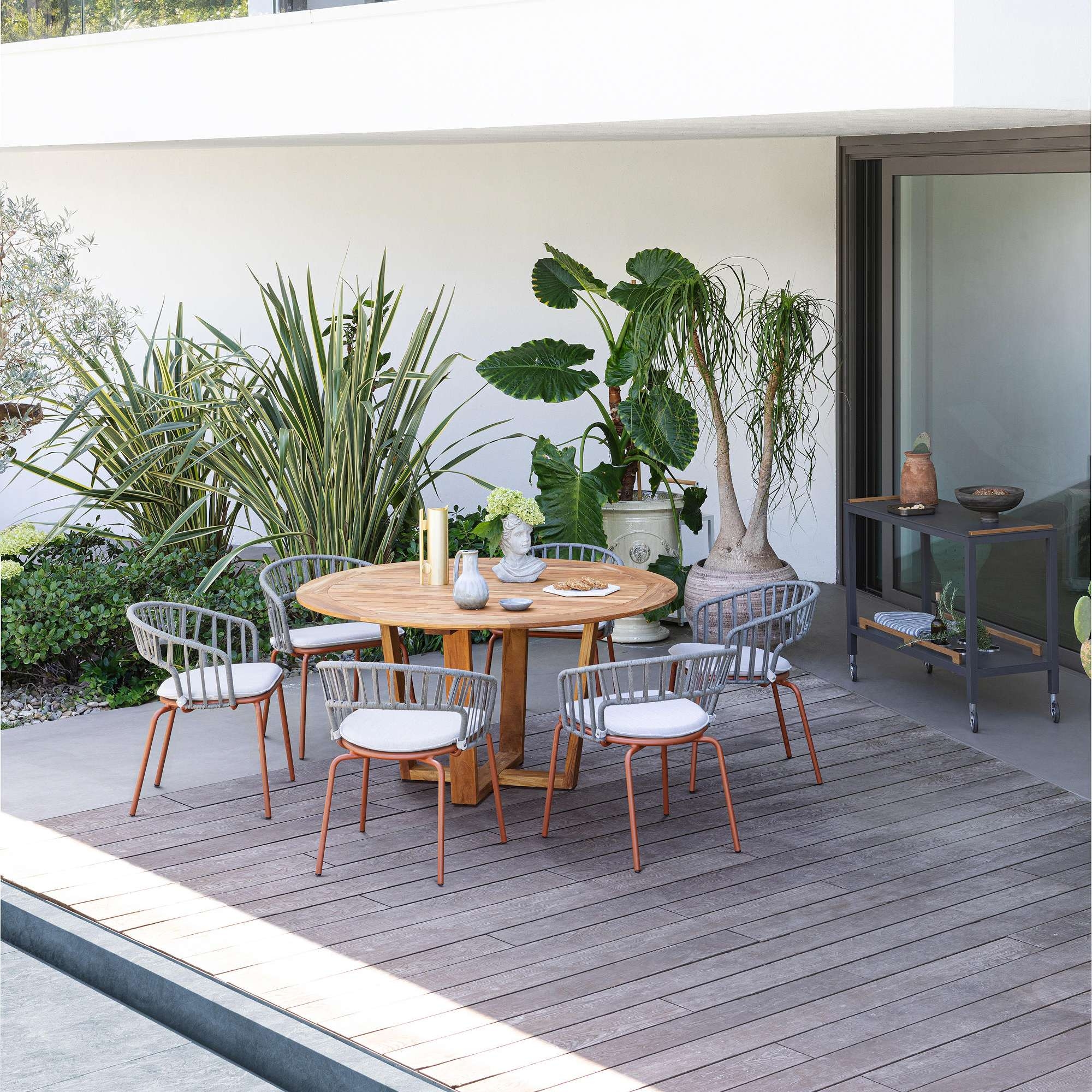 The Onda outdoor chair, crafted with an aluminum frame, handwoven rope backrest, and seat cushion covered in outdoor fabric, epitomizes elegance and comfort while keeping pace with the latest design trends. It boasts a distinctive woven backrest that wraps around the body, evoking the gentle movement of a wave. The organic and sinuous shapes of the Onda seat invite you to sit down, promising a comfortable and relaxing experience. The backrest combines aesthetics and functionality, featuring an opening in the lumbar area that gives the chair a light and dynamic character. This feature not only enhances comfort but also allows the Onda chair to be stackable. The ability to stack multiple chairs makes it an ideal space-saving solution, easily stored away when not in use. Perfectly suitable for any outdoor setting, from gardens to terraces, and adaptable to both private and public contexts, the Onda chair is the perfect choice for those seeking a furniture solution that blends sophisticated design with practical functionality, adding a distinctive touch of style to any outdoor area. Designed by Busetti Garuti Redaelli for Atmosphera.