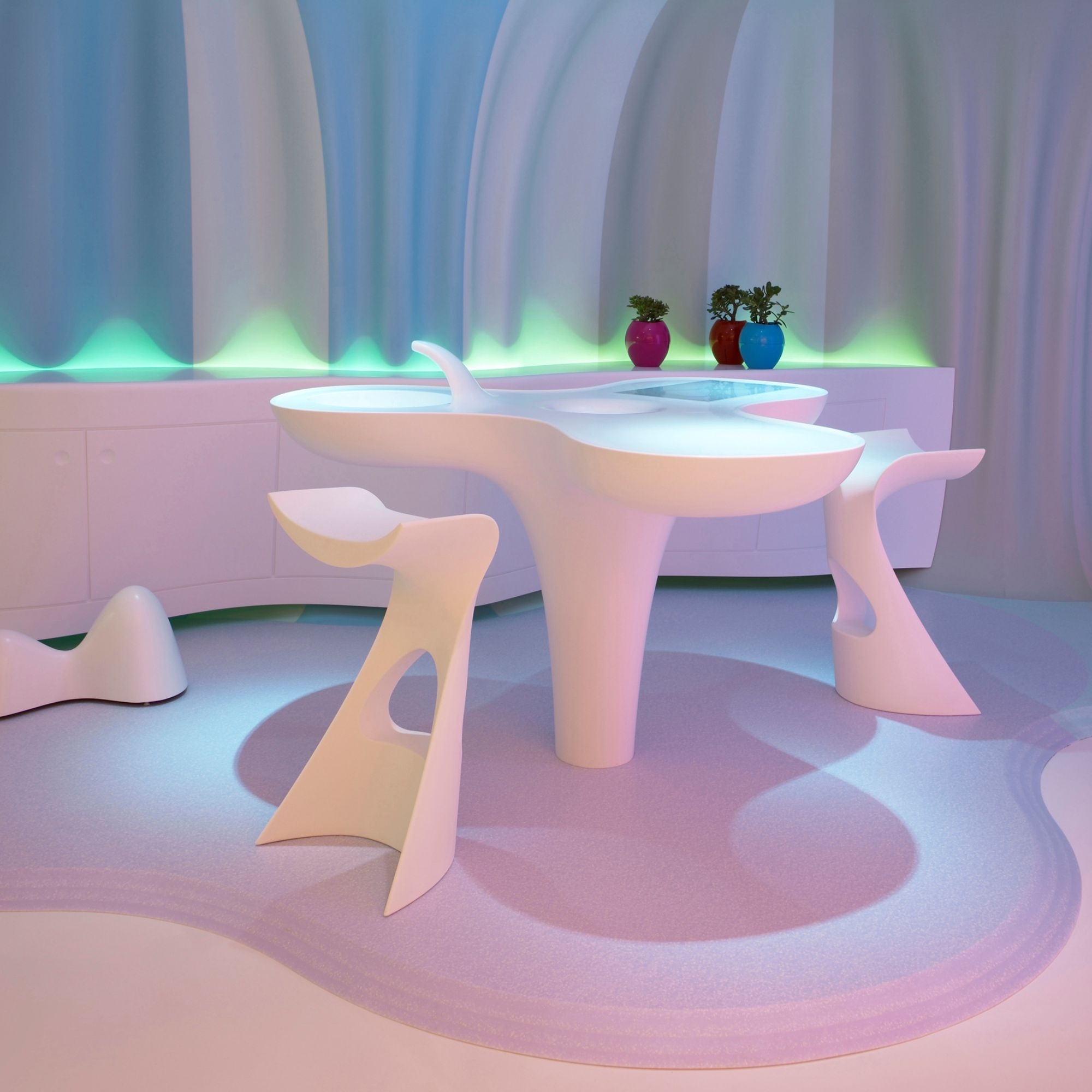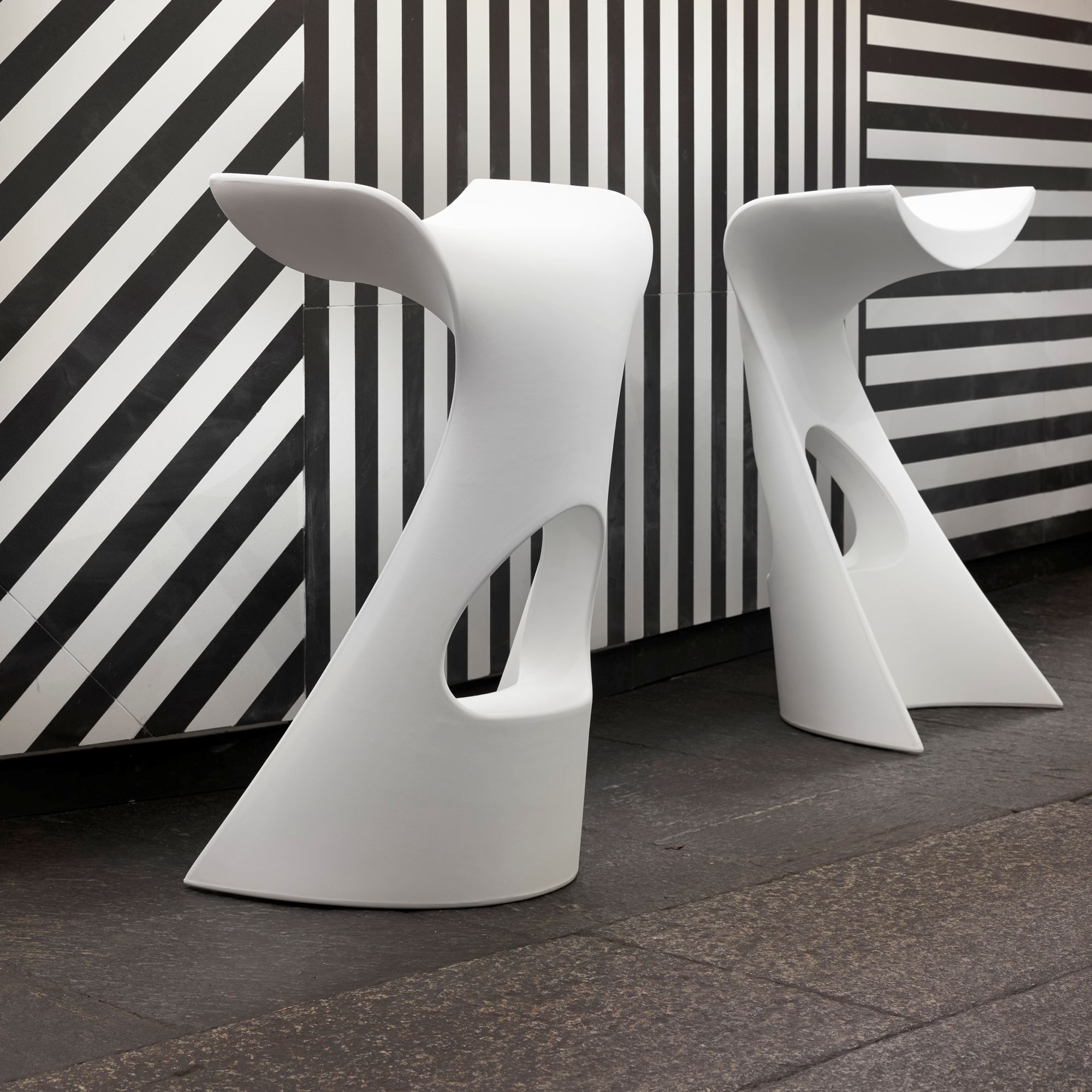 The Koncord high stool is a beautiful piece of furniture designed by Slide, entirely made of polyethylene, a material valued for its durability, longevity, and versatility. This high stool has a curvilinear shape that enhances the silhouette of the Jet table. It has been designed to optimally and uniquely occupy spaces, with its versatile and geometric structure: depending on the user's needs, it can serve as a comfortable seat or a precious piece of furniture. Thanks to its minimalist and essential design, the stool can harmoniously match any type of setting, both indoor and outdoor: from a wide modern terrace to a classic living room, from a garden with a pool to a dining room, adding luxury and class to any space. Its functionality, the comfort of the seat improved by the footrest hole at the base, and the avant-garde design typical of the volcanic designer Karim Rashid have made Koncord one of the flagship products of the entire Slide collection: this product represents a furnishing solution with a great visual impact and practicality, capable of transforming every corner, both inside and outside, into an oasis of style and comfort. Design by Karim Rashid for Slide.