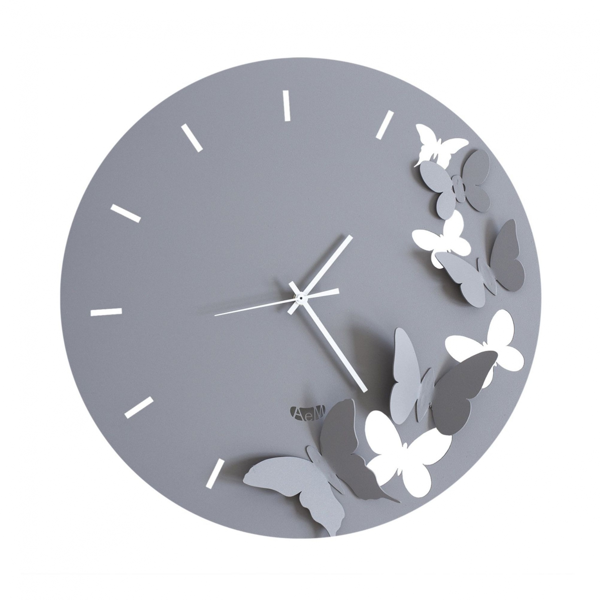 Orologio da parete Butterfly Spring è realizzato in ferro con una forma tonda tipica degli orologi. La decorazione consiste in un gruppo di farfalle, alcune tridimensionali e altre disegnate. Il ferro è il materiale di punta del brand che viene tagliato a laser per mescolarsi con i colori e restituire un mood leggero e contemporaneo. Realizzato da Arti e Mestieri.