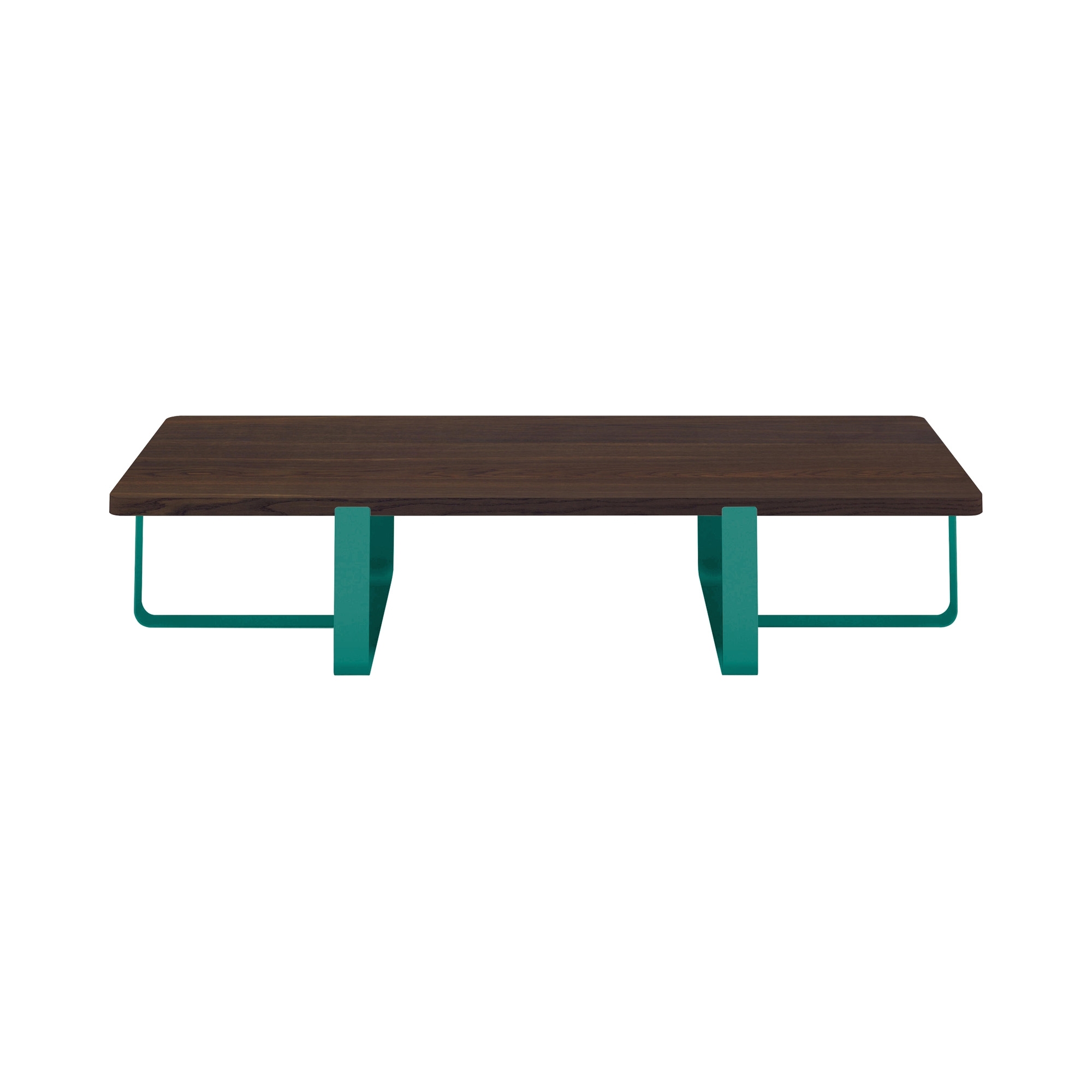 Inn double coffee table made with metal base (available in 16 RAL colors and 2 metallic colors) and smoked oak top. Ideal for those looking for a piece of furniture that combines style and practicality, the Inn coffee table offers a large surface that can accommodate a variety of objects, from books to coffee cups. The smoked oak wood adds a touch of warmth and character, creating a charming contrast with the metal legs. Designed by Carlo Trevisani for Meme Design.